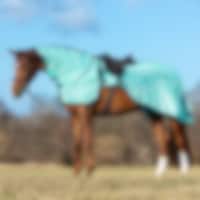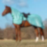 Ridedekken i finmasket polyesternetting som beskytter hesten mot fluer på rideturen. Konturskåret passform som passer rundt salen og gir plass til sjenkelen. Avtakbart halsdekken med borrelåsfester og rem til festing i hodelaget. Vevd Fairfield-bånd langs mankam og rygg.