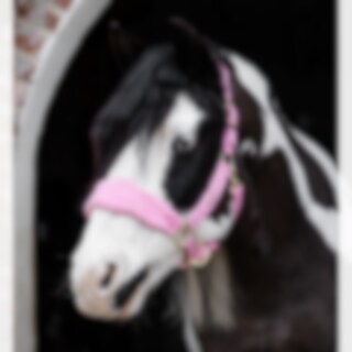 En grime med myk pilé ved nesen, halsen og de justerbare sidestykkene. Gullfargede spenner.