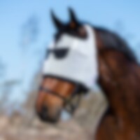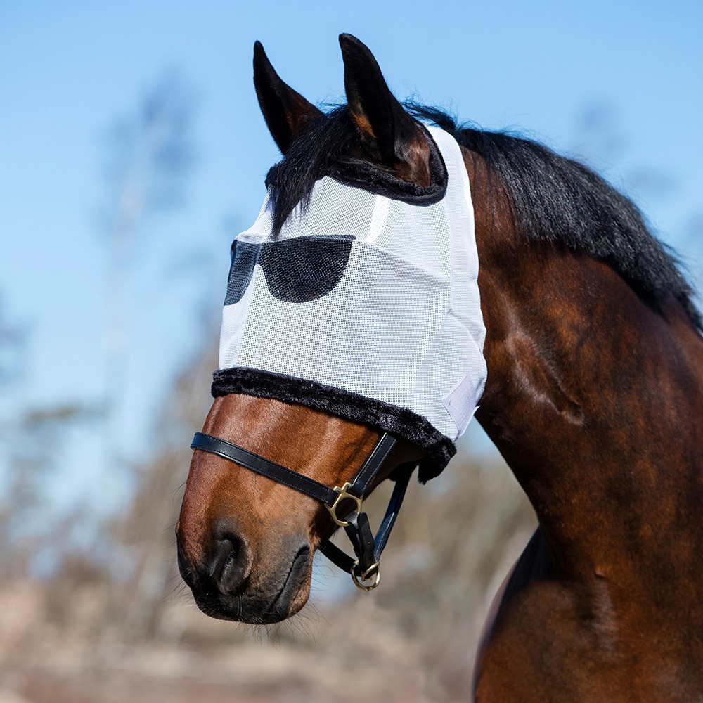 Fluemaske i netting som beskytter hestens øyne mot irriterende fluer. Masken har myk teddykant og bred, sterk borrelås. Morsomt brilletrykk i svart.