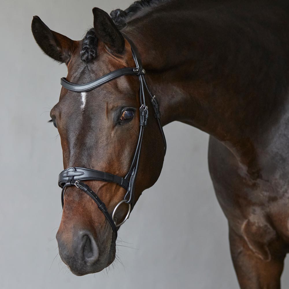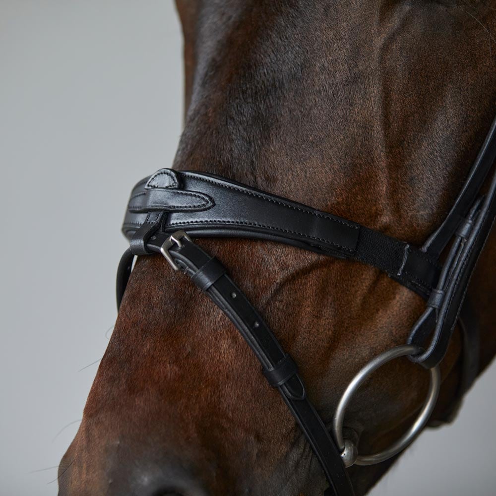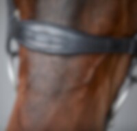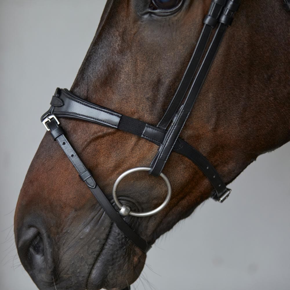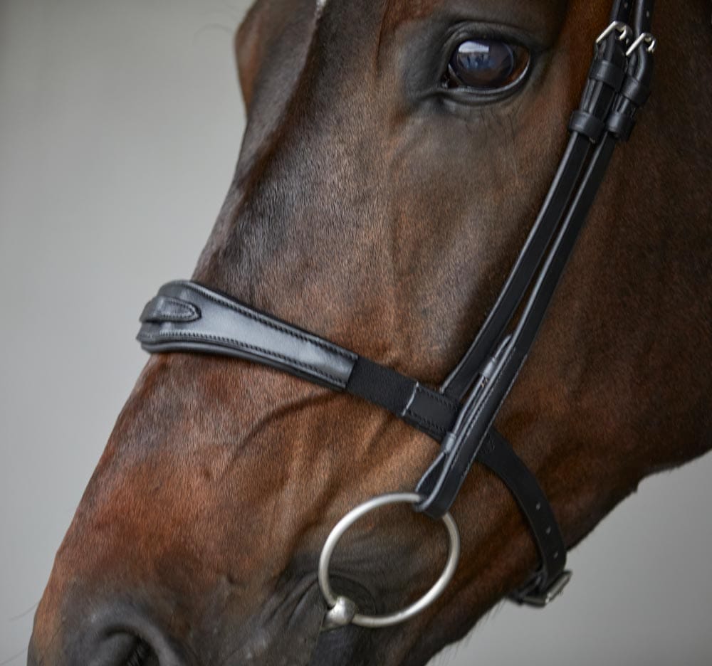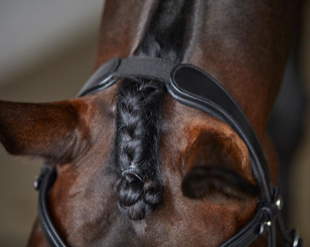 Aachenhodelag med nakkestykke som har en strikkdel på midten. Neserem med helt avtakbar aachenrem og strikk på begge sider som gjør det mer behagelig for hesten. Husk at strikken strekker seg – grimen skal ikke strammes hardere enn en vanlig grime da dett