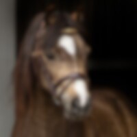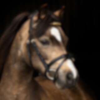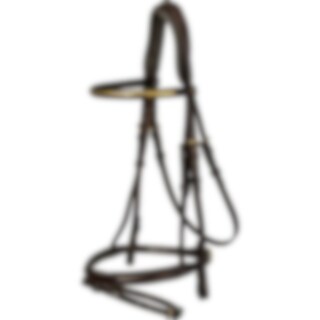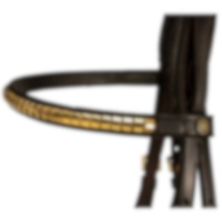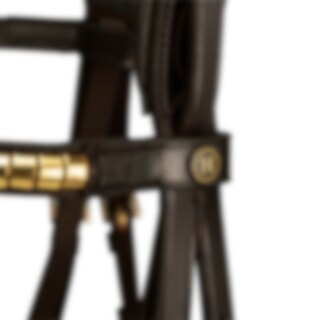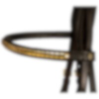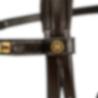 Aachenhodelag i europeisk lær. Neseremmen og nakkestykket har mykt fôr. Buet, bredt nakkestykke der neseremmens rem tres utenpå. Pannebåndet er dekorert med messingfargede nagler.