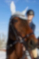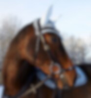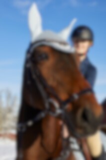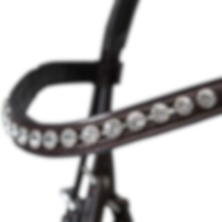 Remonthodelag i europeisk, vegetabilsk garvet lær. Justerbar neserem med mykt fôr. Buet, fôret pannebånd med hvite steiner, anatomisk formet nakkestykke med mykt fôr.