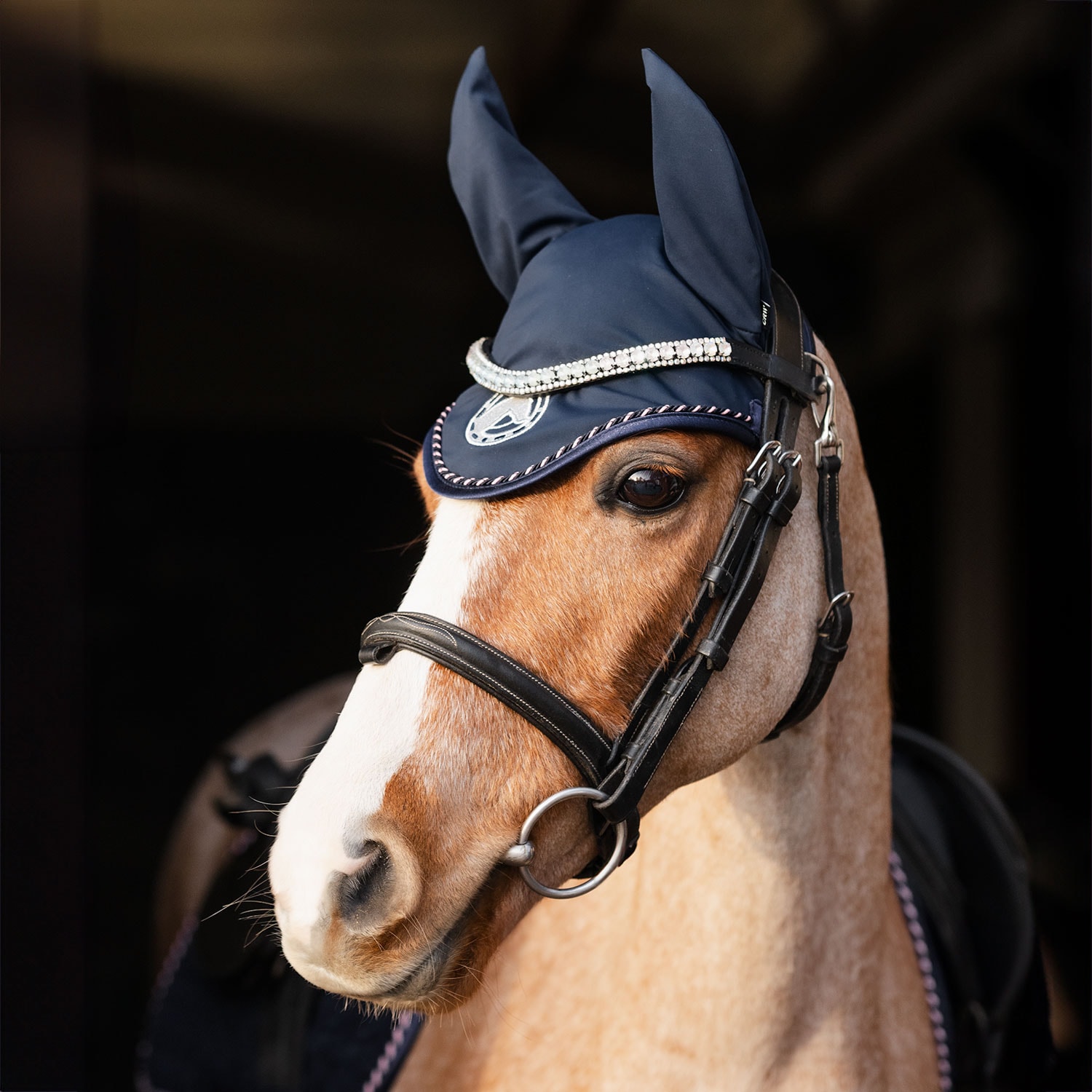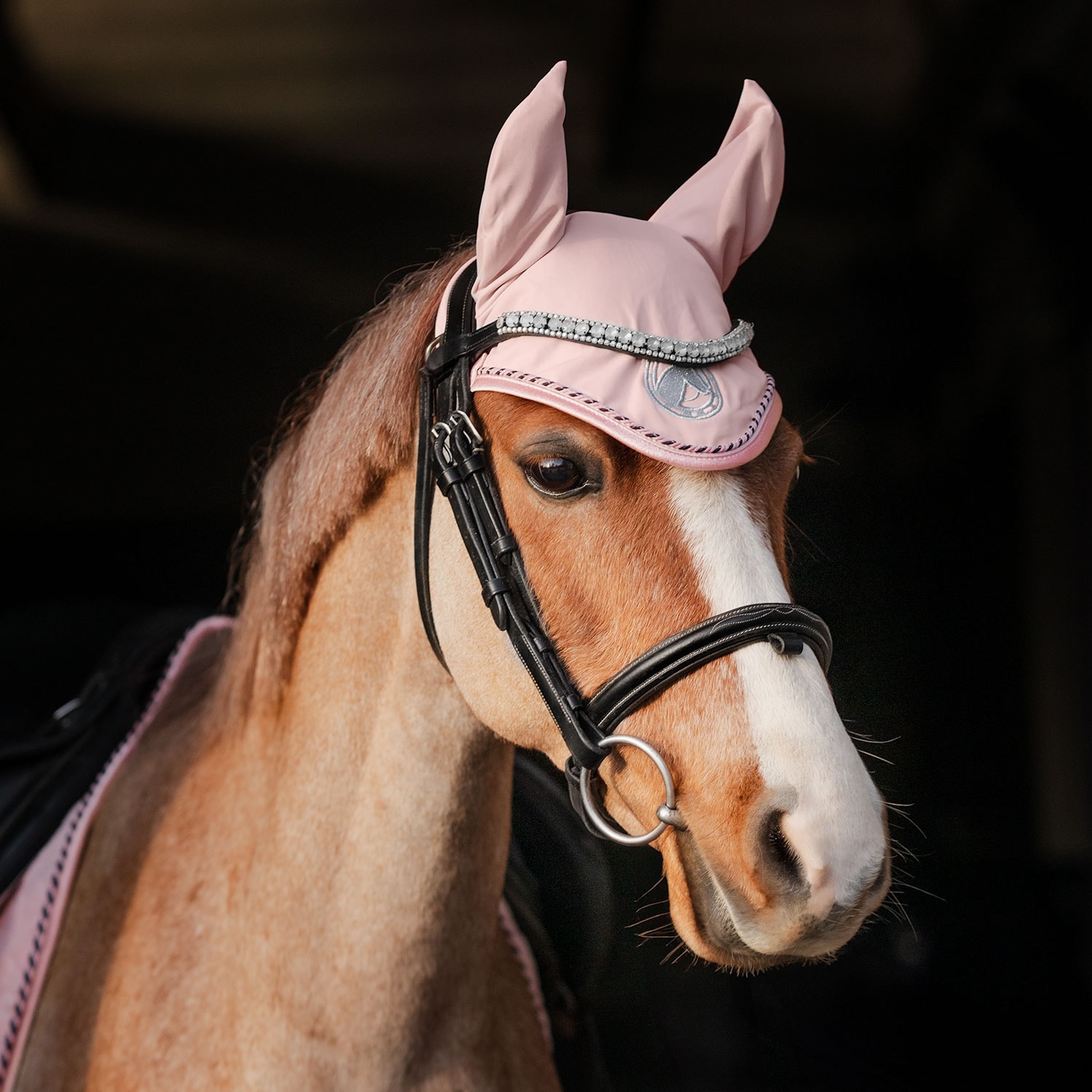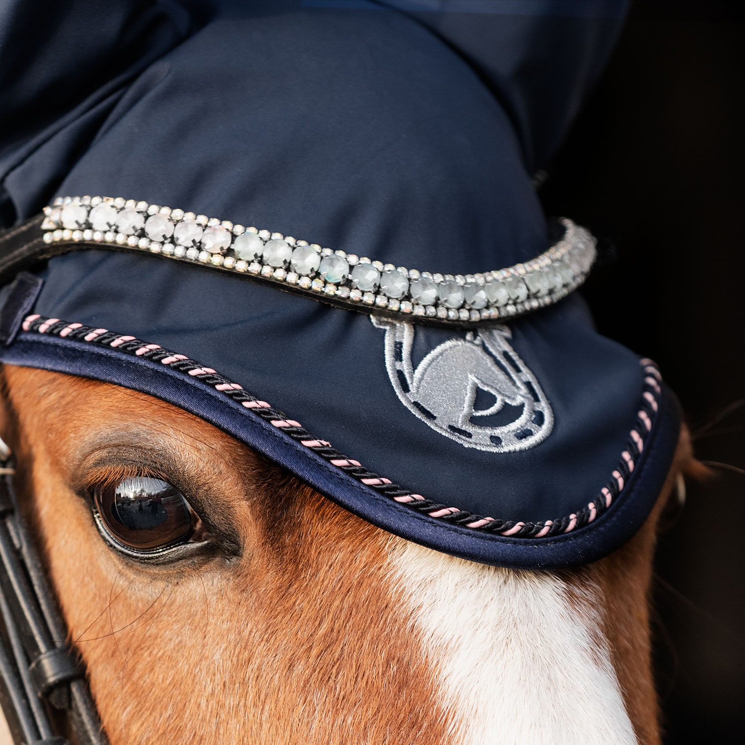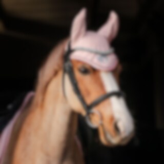 Myk, fleksibel hette i elastisk 100 % polyester. Beskytter mot insekter og kan suppleres med lydløse innlegg om nødvendig for å beskytte mot støy. Dekorert med silkepassepoil, glitterkantbånd og glitterbroderi.