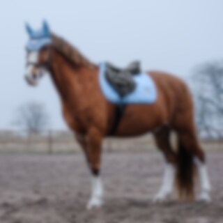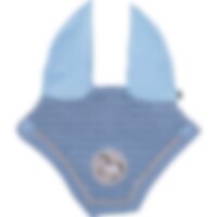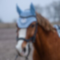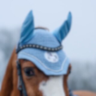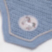 Heklet bomullshette med ører i lycra. Dekorert med lurex-piping og enhjørningsbroderi på en glitrende bakgrunn.