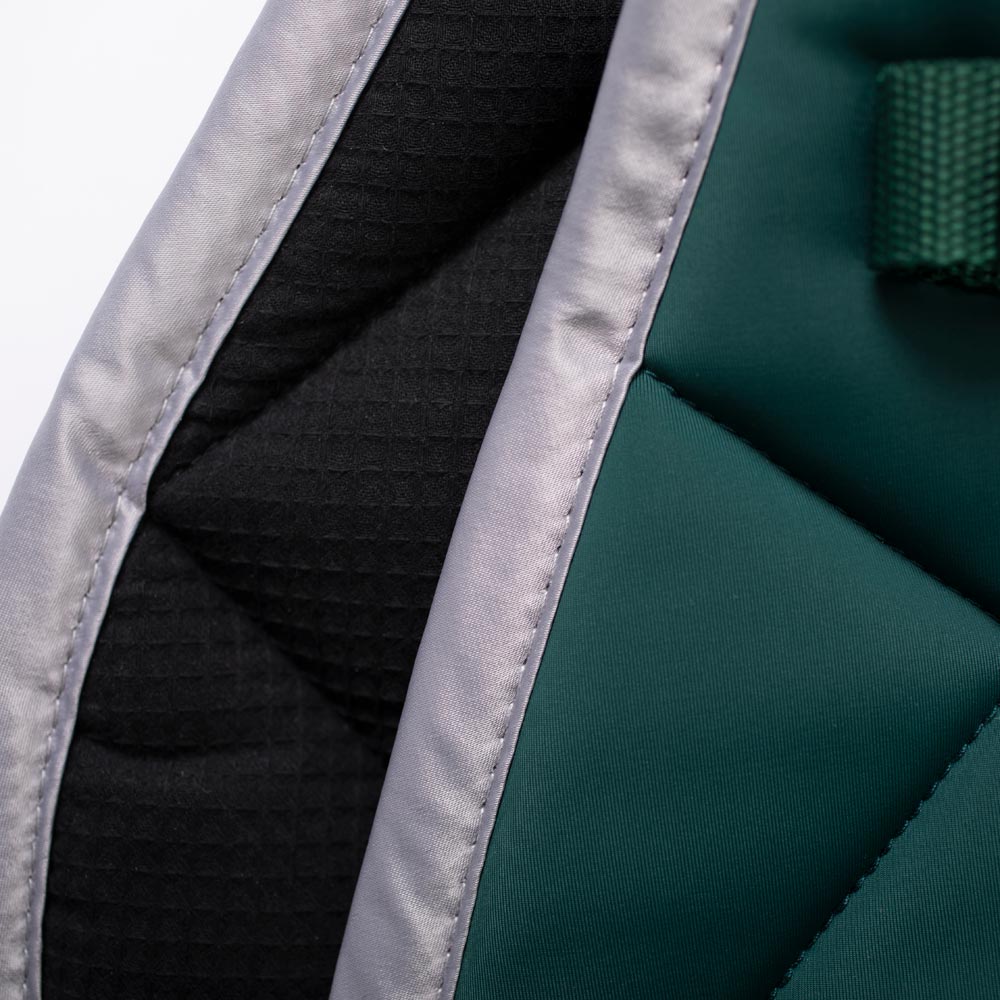 Sjabrak med klassisk rutet quilt i smidig og fleksibel nylonspandex som gir en smussavvisende overflate. Holder fargen og formen i vask etter vask. Kraftig kombinasjonsvattering i 500 g polyesterfyll + 0,8 mm skum gir en støtdempende effekt samtidig som det bidrar til at sjabraken holder formen. Innside i vaffelvevd bomull som danner luftsirkulasjon slik at svetten tørker raskere. Bredt kantbånd i matt sateng. JH-logo. Ikke egnet for brodering.