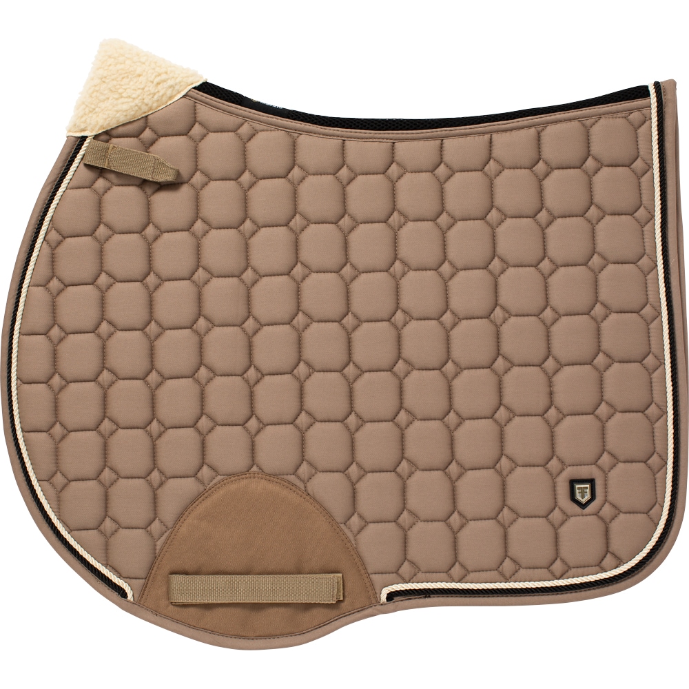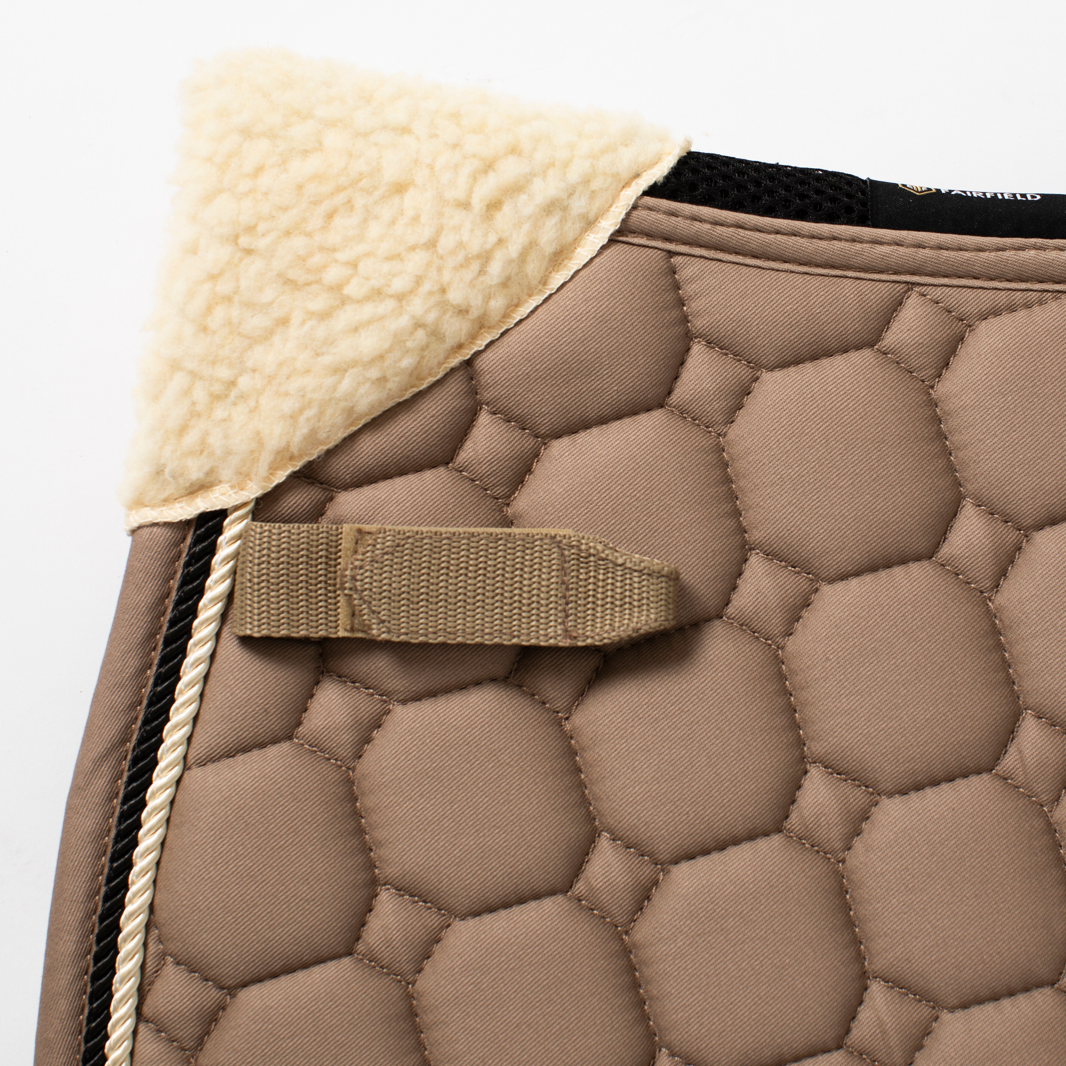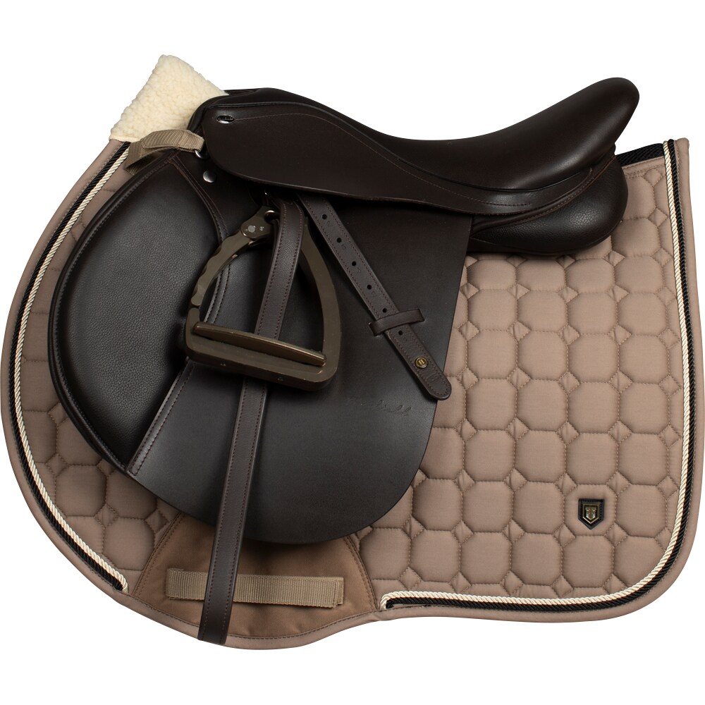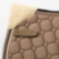 Vattert skjerf med et ytre lag av silkemyk bomullstwill. Kraftig kombinasjonsvattering i 300 g polyfill + 1 cm skum gir et solid skjerf som både holder formen og holder seg på plass. Innside i 100 % polyesterfunksjonsmateriale bidrar til å transportere fuktighet bort fra hesten. Teddyfôr ved manken hindrer gnagsår, og 3D-nettingpanel langs ryggraden for å gi god ventilasjon. Ekstra forsterkning ved salgjorden gir økt slitestyrke og korte stropper for feste i salens d-ring gjør at sjabraken passer til de fleste saler.