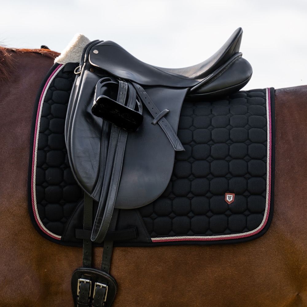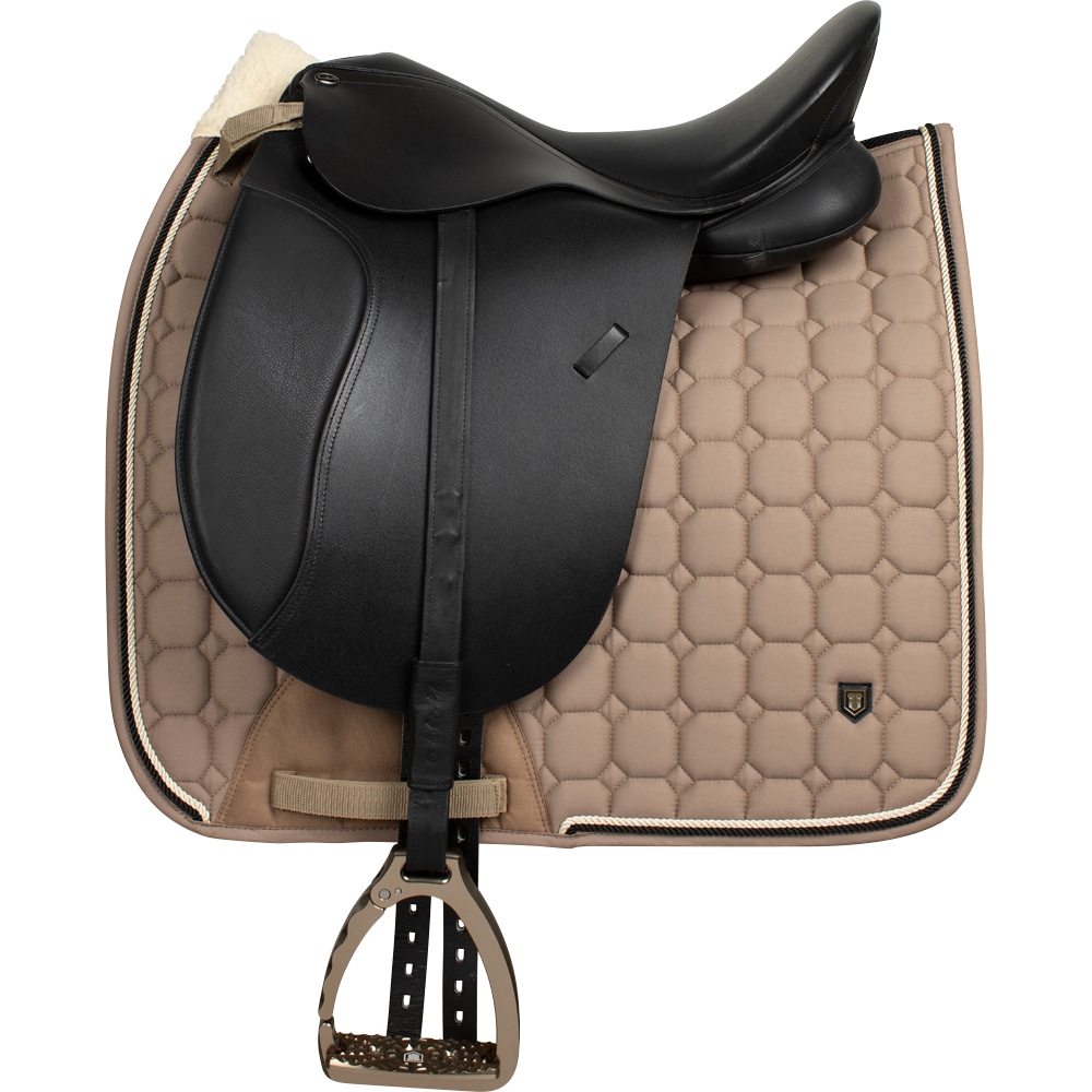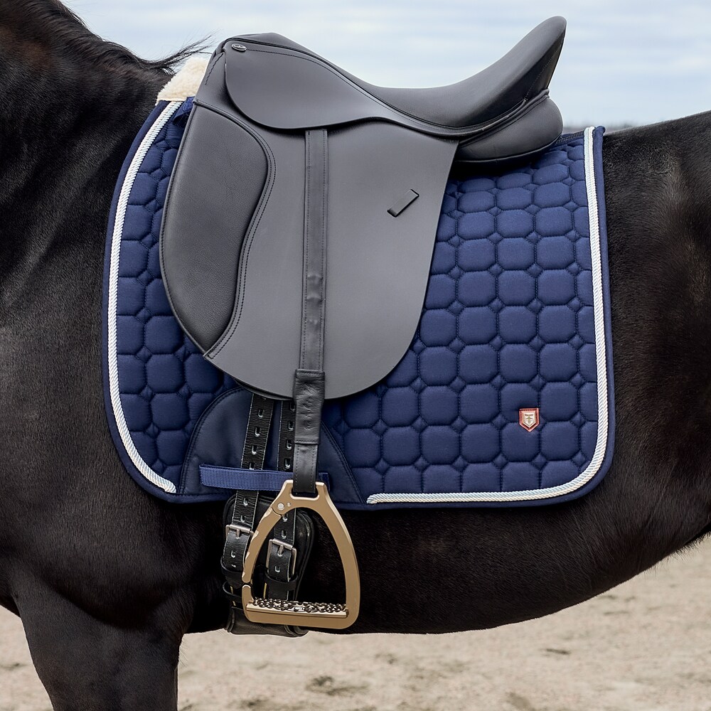 Vattert skjerf med et ytre lag av silkemyk bomullstwill. Kraftig kombinasjonsvattering i 300 g polyfill + 1 cm skum gir et solid skjerf som både holder formen og holder seg på plass. Innside i 100 % polyesterfunksjonsmateriale bidrar til å transportere fuktighet bort fra hesten. Teddyfôr ved manken hindrer gnagsår, og 3D-nettingpanel langs ryggraden for å gi god ventilasjon. Ekstra forsterkning ved salgjorden gir økt slitestyrke og korte stropper for feste i salens d-ring gjør at sjabraken passer til de fleste saler.
