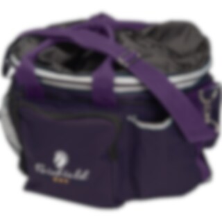 Pusseveske med bærehåndtak og justerbar skulderrem. Lokk med glidelås som forhindrer at børstene detter ut. Lommer på utsiden med plass til småting, og innvendig lomme med glidelås. Ø ca. 38 cm. Høyde: ca. 27 cm.