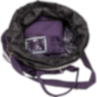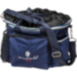 Pusseveske med bærehåndtak og justerbar skulderrem. Lokk med glidelås som forhindrer at børstene detter ut. Lommer på utsiden med plass til småting, og innvendig lomme med glidelås. Ø ca. 38 cm. Høyde: ca. 27 cm.