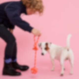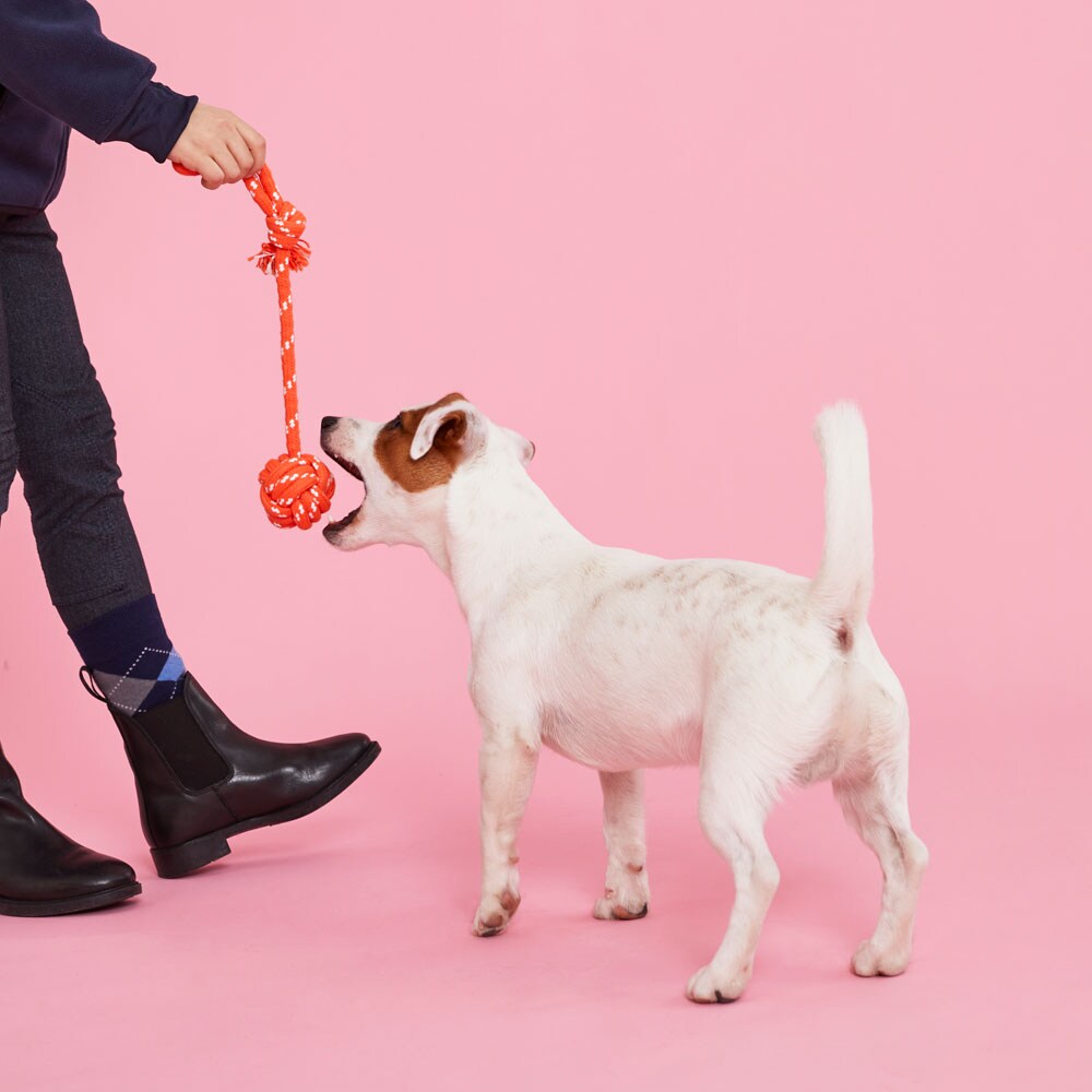 Solid hundeleke i polyester/bomullstau. Kraftig, knyttet ball med tau og håndtak. Fin å kaste, apportere eller bruke til drakamp. Kommer i fire herlige, assorterte farger. Total lengde 40 cm.