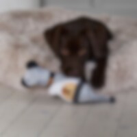 Mykt stoppet hundeleke i fuskemokka. Inspirert at nissens hjelpere. Med pipelyd. Lengde ca. 25 cm, fra toppen av luen til nederst på kroppen.