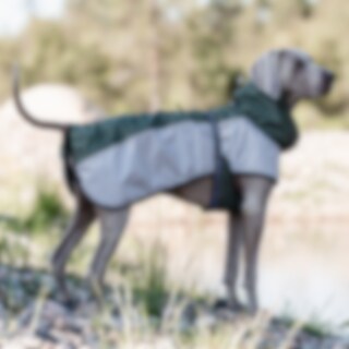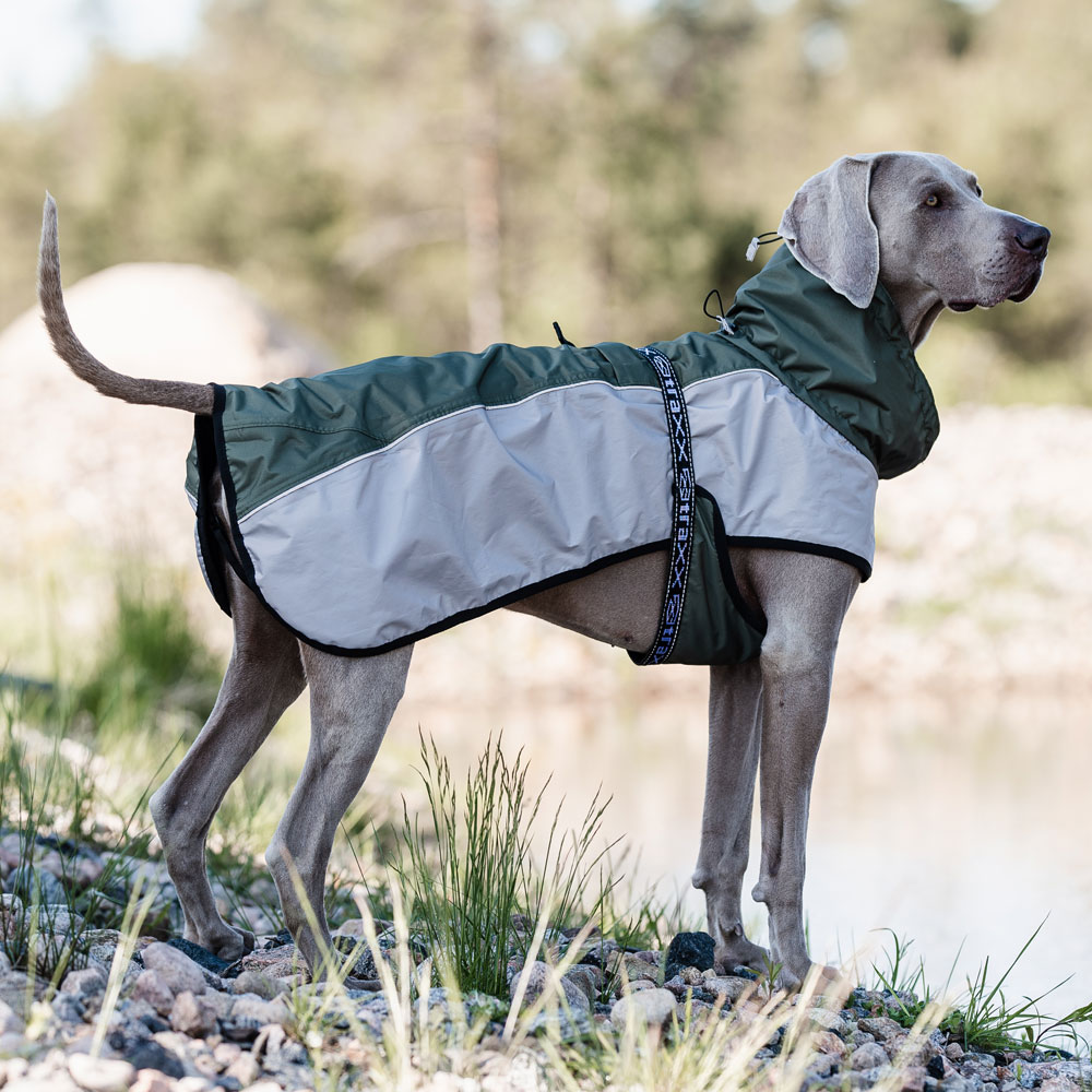 Vanntett skalldekken med refleksdetaljer og nettingfôr. Høy, nedbrettbar krage med snøring både øverst og i halsåpningen slik at du kan justere passformen til å akkurat din hund. Justerbar magegjord med reflekspiping gir økt synlighet. Skjult åpning til sele på ryggen, og hull i kragen til kobbel. Elastiske beinsnorer. 3000 mm vannsøyle bidrar til å holde hunden din tørr, selv i kraftig regnvær. 3000 MTV pustefunksjon for å unngå dannelse av kondens under dekkenet.