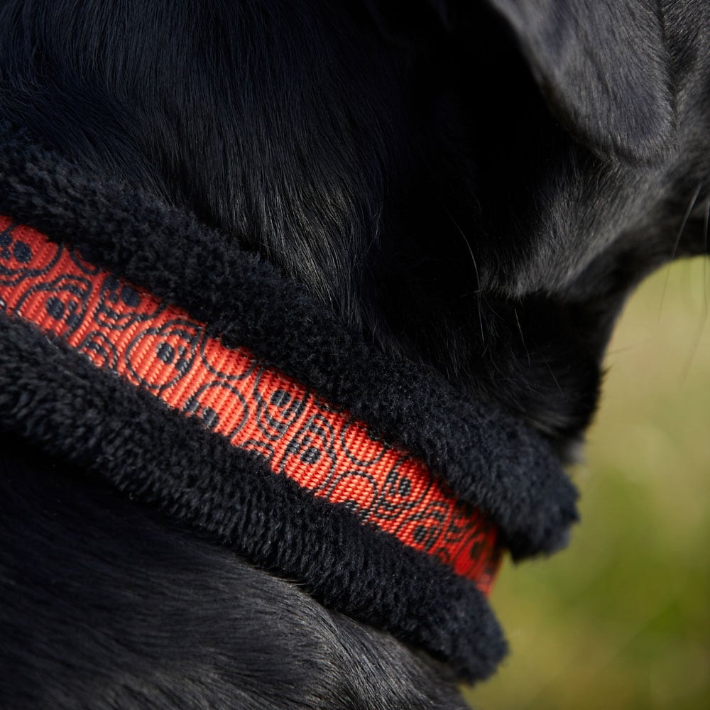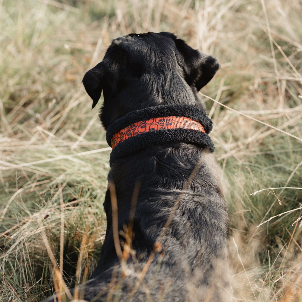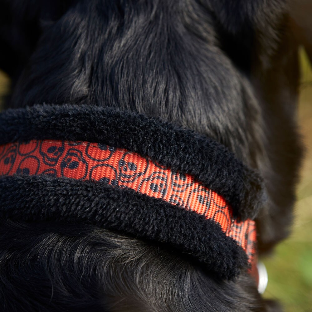 Halsbånd i polyester. Vevde bånd fôret med myk teddyfleece for å motvirke gnag. Spenner og beslag i rustfritt stål gir god holdbarhet og trekkfasthet.