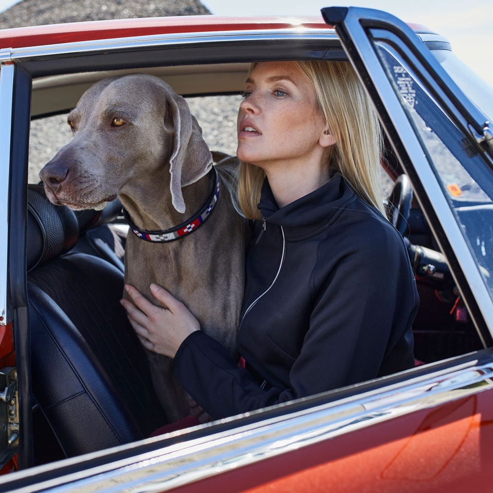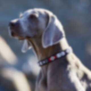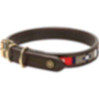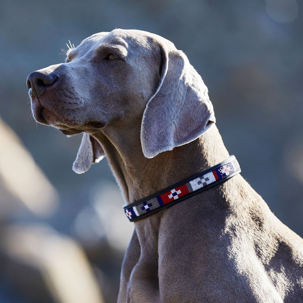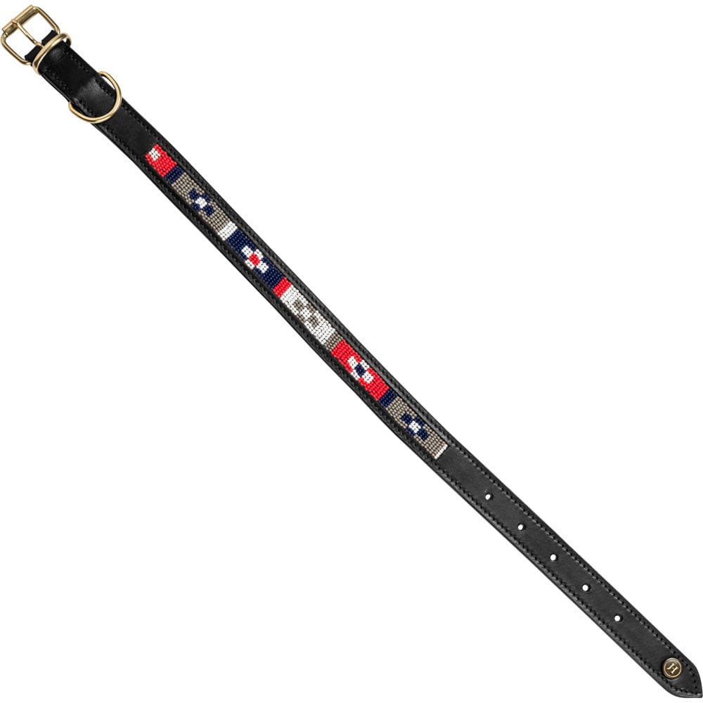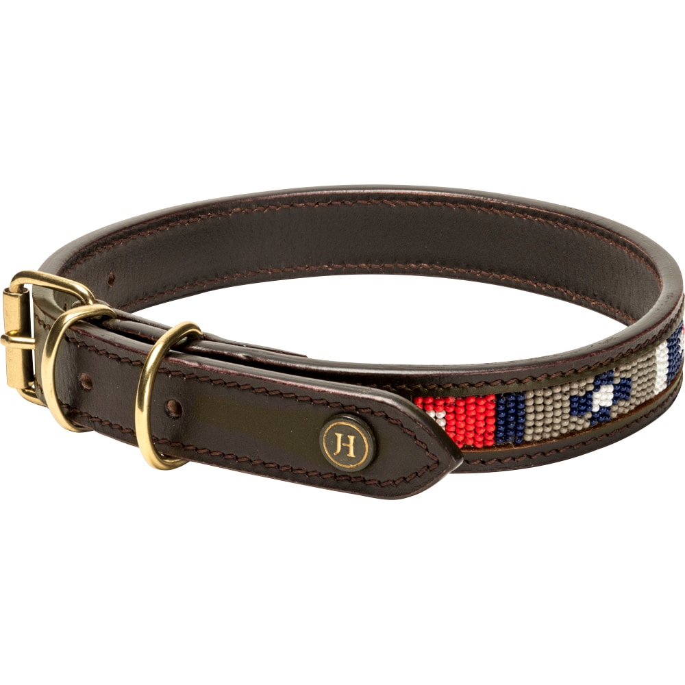 Hundehalsbånd i mykt og smidig lær som er komfortabelt for hunden din. Dekorert med håndsydde perler. Spenner og D-ring i messing.