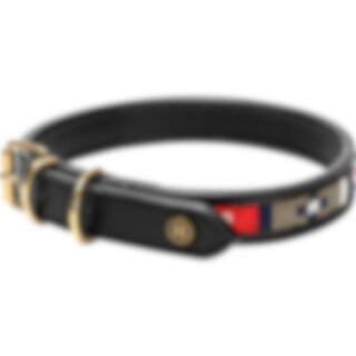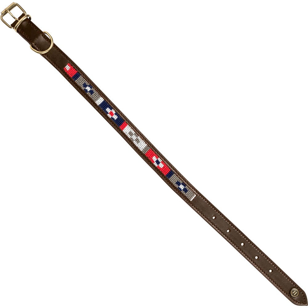 Hundehalsbånd i mykt og smidig lær som er komfortabelt for hunden din. Dekorert med håndsydde perler. Spenner og D-ring i messing.