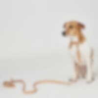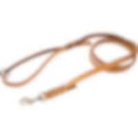 Hundekobbel i lyst, naturfarget lær med klassisk flettet feste til håndtak og ved bisselkroken. Bredde 15 mm. Lengde 180 cm. Matcher med hundehalsbånd 043152.