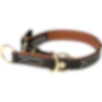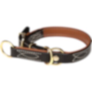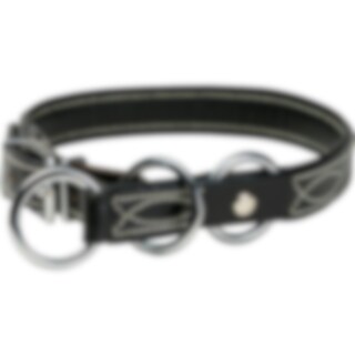 Eksklusivt, stillbart lærhalsbånd med mykt fôr for best mulig komfort. Gulldetaljer og hvite dekorsømmer. Bredde: 22 mm.