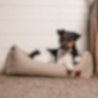 Stilren hundeseng laget av resirkulert polyester. Den avtakbare puten gjør det enklere å rengjøre hundesengen. Den ene siden av puten har myk teddyfleece, og den andre siden er av samme stoff som resten av sengen. Hunden får bestemme hva som er mest behagelig! Myke polstrede kanter. Fyllet er 100 % gjenvunnet polyesterfiber. Sengen har en sklisikker base som holder den på plass. Størrelse S: 55 x 40 x 18 cm, M: 70 x 50 x 20 cm, L: 85 x 60 x 22.