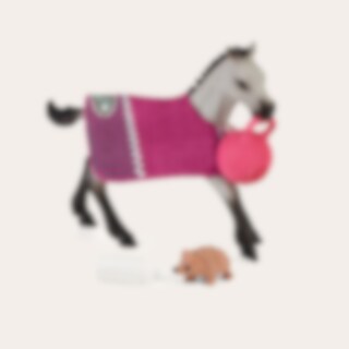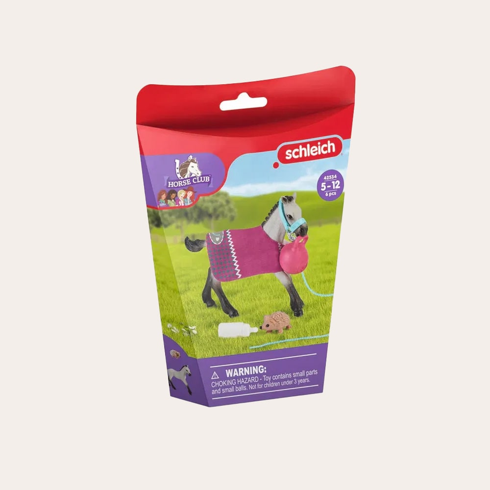Lekesettet med føllet fra schleich® HORSE CLUB inneholder en spesiell ball som er designet for lek med hester. Ballen har et håndtak som Quarter Horse-føllet kan gripe tak i med tennene. Under leken forveksler føllet ballen med et pinnsvin og kjenner straks de skarpe piggene! Heldigvis skjer det ingenting, det er bare moro, og de to blir bestevenner. Etter å ha lekt seg ferdig, hviler føllet seg med en slurk fra sutteflasken sin. Den er også pakket inn i et varmt teppe slik at den ikke blir kald.
