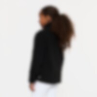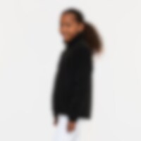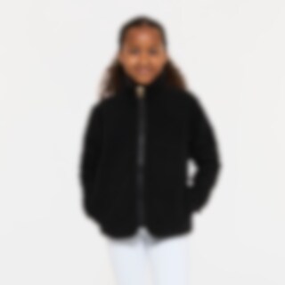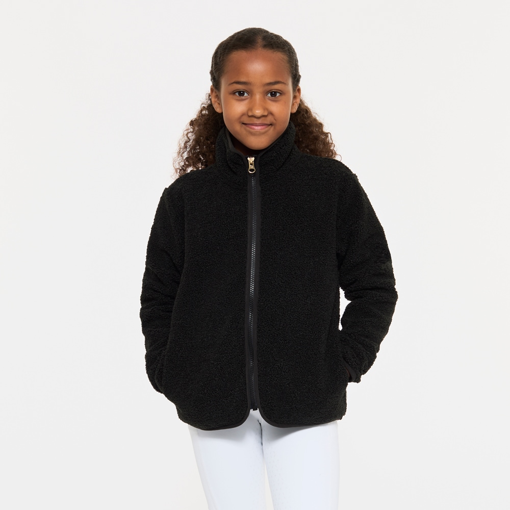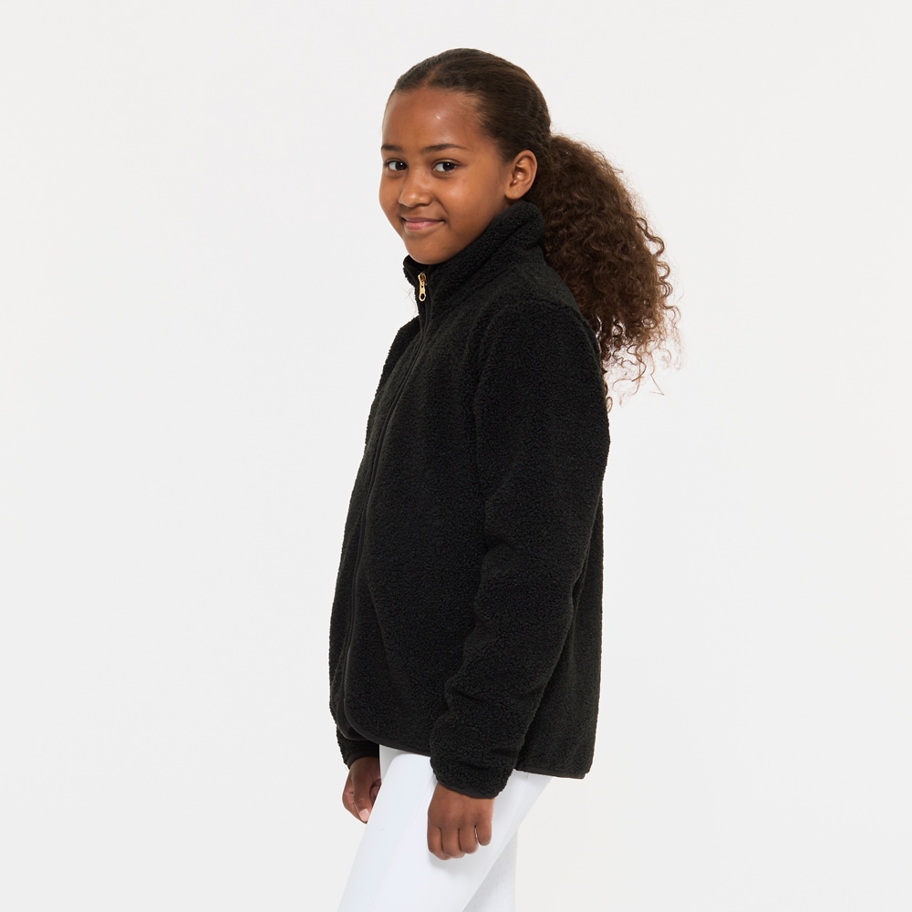 Myk fleecegenser i softpilé med høy krage, glidelås foran og to åpne lommer.