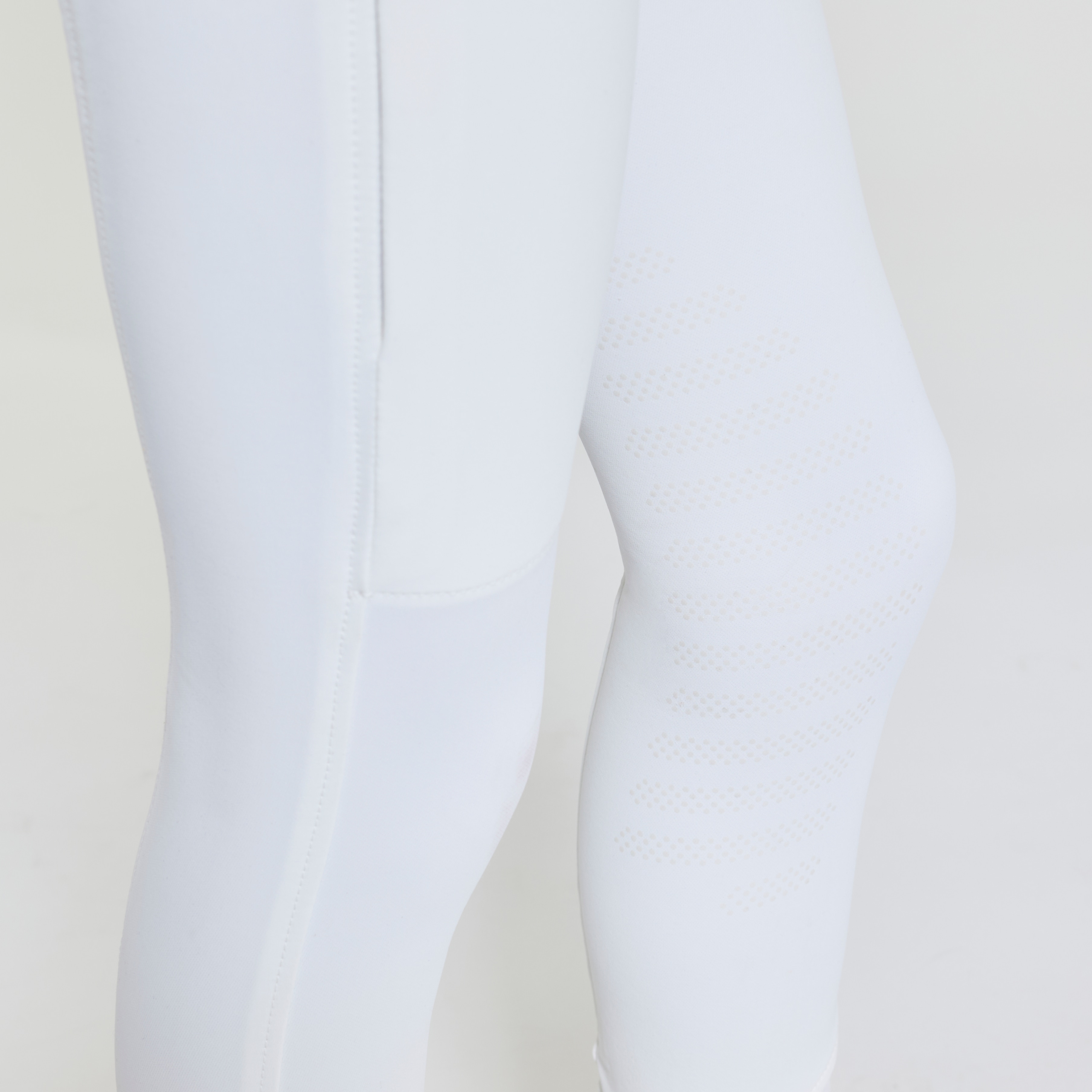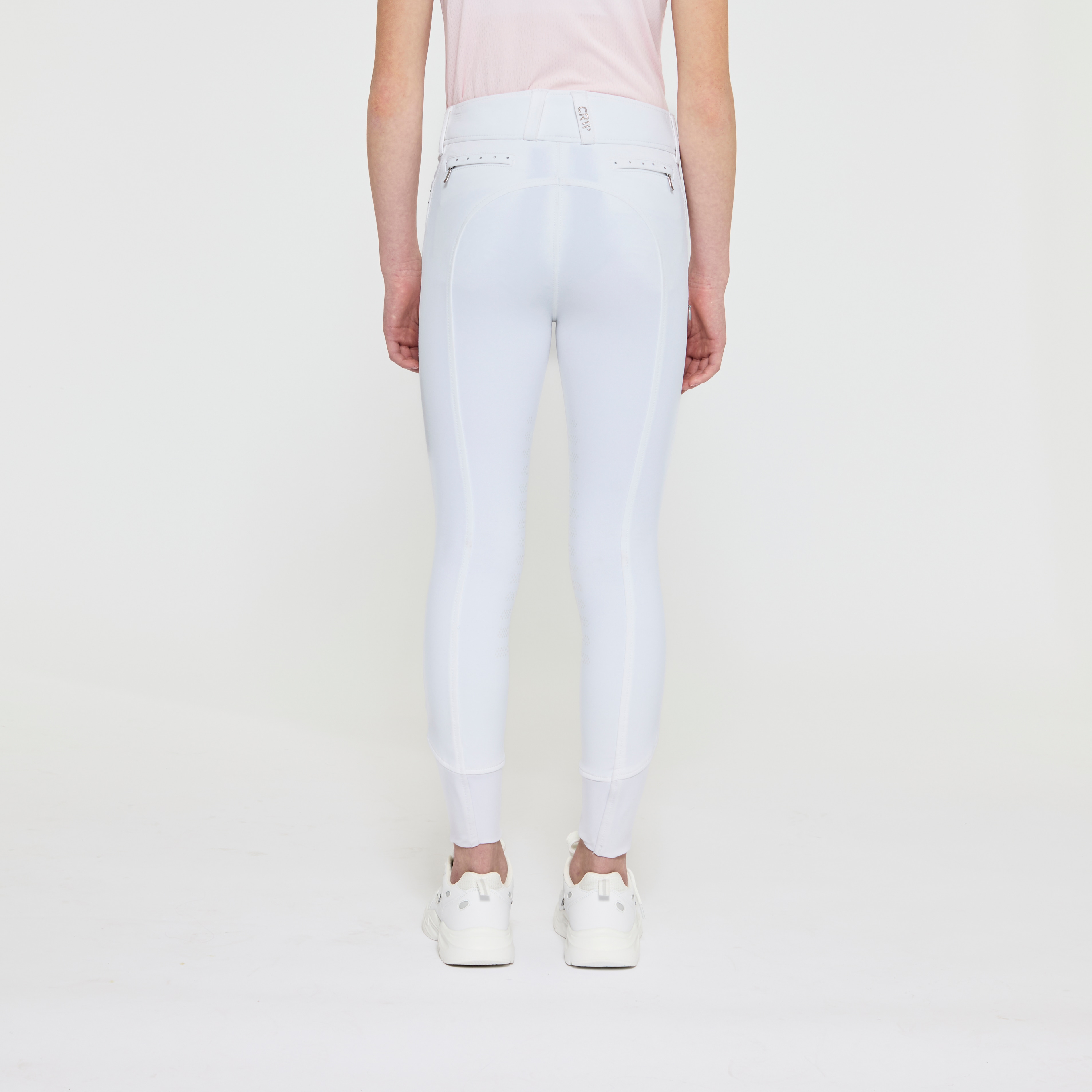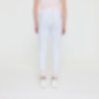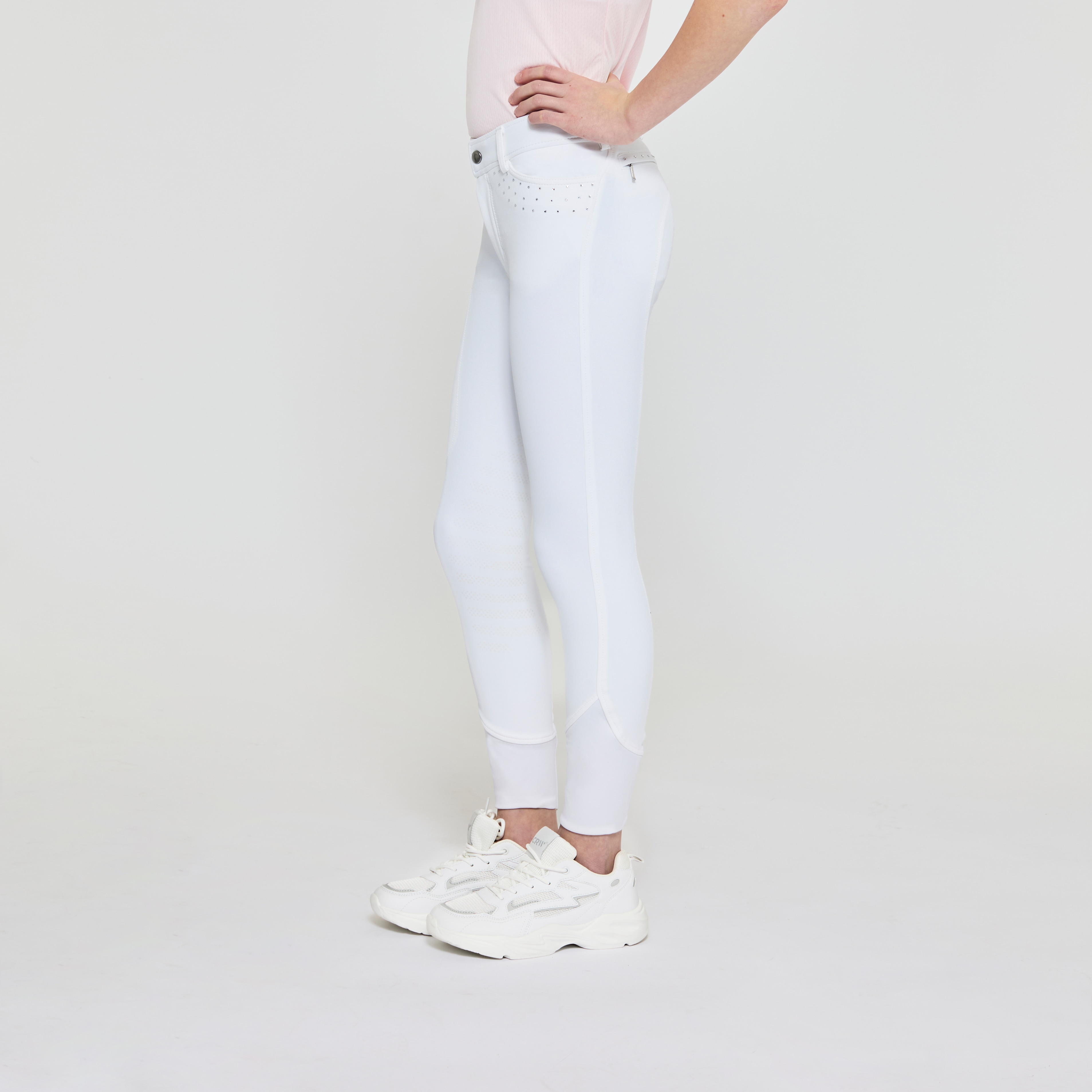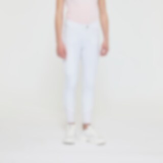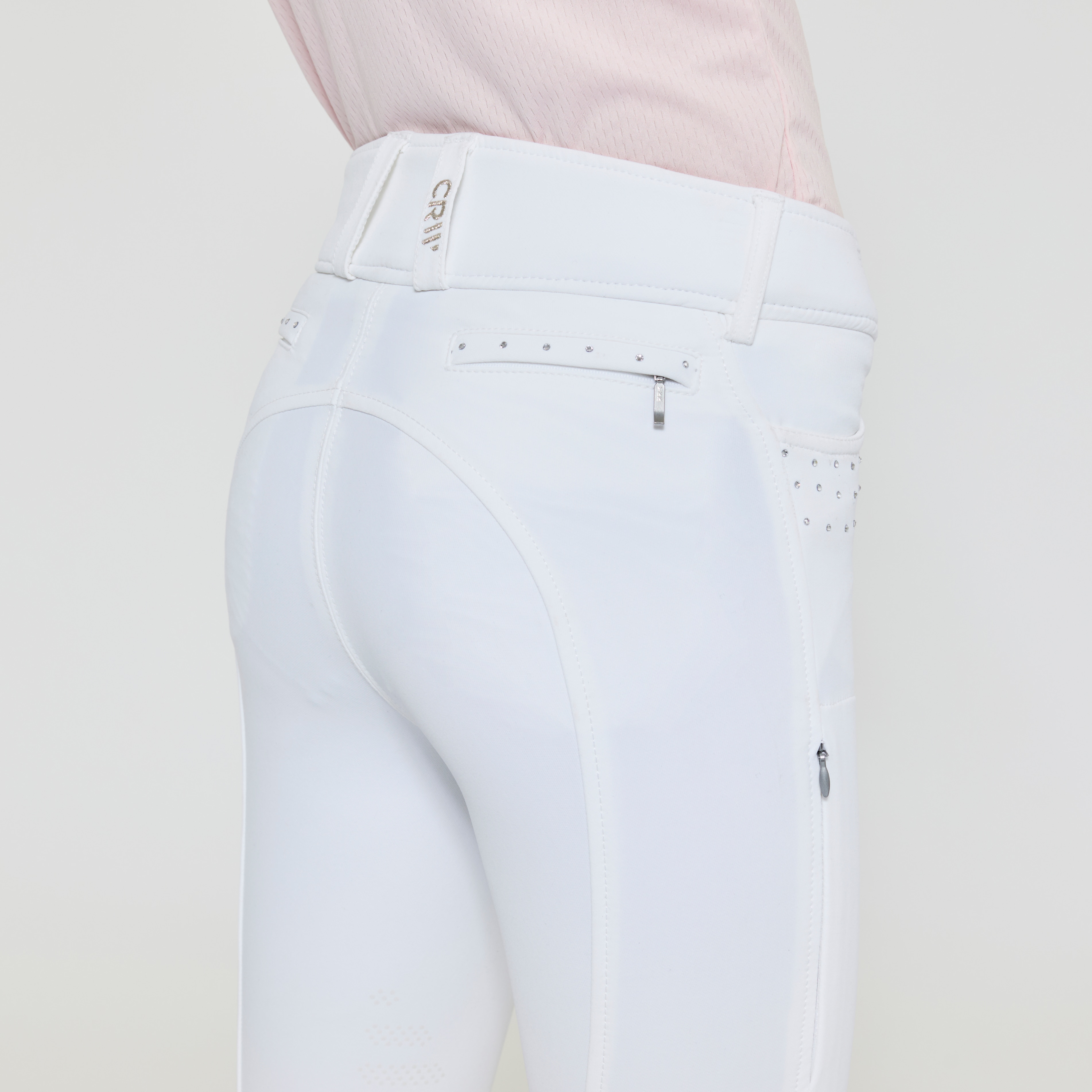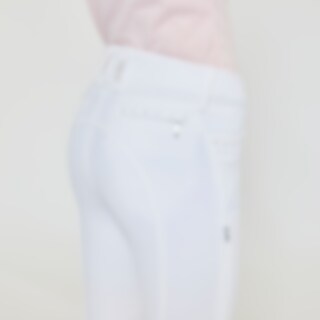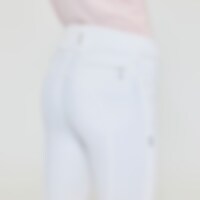 Vevd ridebukse med salsnitt i elastisk funksjonsmateriale. Formfast kvalitet som er slitesterk, smussavvisende og meget behagelig å ha på. Kneforsterket med grep som fortsetter på innsiden av lårene for optimalt feste og støtte i salen uten at buksen er helforsterket. Elastikk ved anklene. Normalhøyt liv med to knapper som gjør at ridebuksen sitter godt på plass og gir økt komfort. To lommer foran og to lommer med glidelås bak. Diskré mobillomme med glidelås på utsiden av låret. Pen detalj med strassperler ved lommene gir en elegant look. Noe liten i passformen, vi anbefaler derfor at du går opp en størrelse.