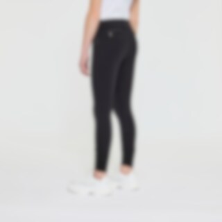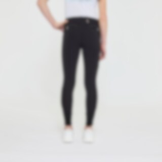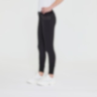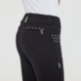 Vevd ridebukse med salsnitt i elastisk funksjonsmateriale. Formfast kvalitet som er slitesterk, smussavvisende og meget behagelig å ha på. Kneforsterket med grep som fortsetter på innsiden av lårene for optimalt feste og støtte i salen uten at buksen er helforsterket. Elastikk ved anklene. Normalhøyt liv med to knapper som gjør at ridebuksen sitter godt på plass og gir økt komfort. To lommer foran og to lommer med glidelås bak. Diskré mobillomme med glidelås på utsiden av låret. Pen detalj med strassperler ved lommene gir en elegant look. Noe liten i passformen, vi anbefaler derfor at du går opp en størrelse.