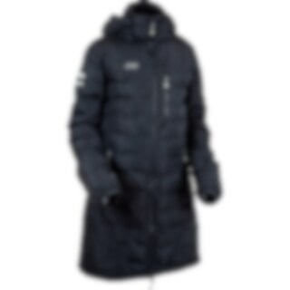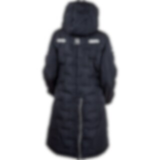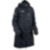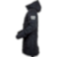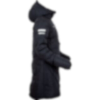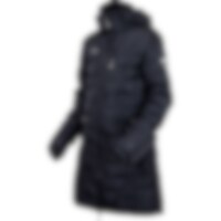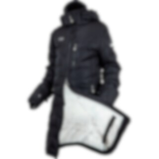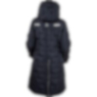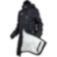 Frakk i figursydd og sporty modell med ekstra stoff ved håndleddene som kan brettes ned for å beskytte hendene mot regn og vind. Toveisglidelås foran, høy splitt bak og beinsnorer på innsiden som holder frakken på plass. Høy krage med fleecefôr. To håndlo
