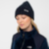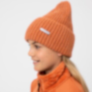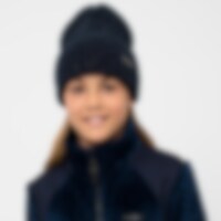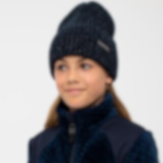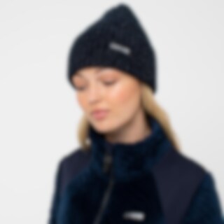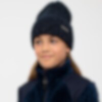 Ribbestrikket lue med sølvfargede lurextråder i garnet. Bred brettekant, fint detaljert med logo.