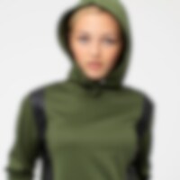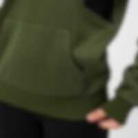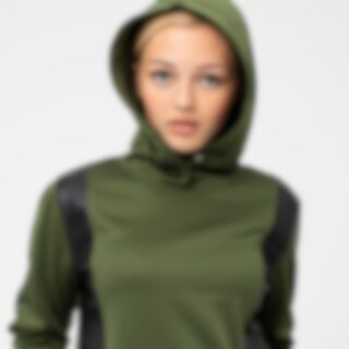 Hettegenser i et mykt og herlig funksjonelt materiale med børstet innside. Åpen, gjennomgående lomme foran, og ribbestrikk ved håndledd og i nederkant. Dekorative knapper foran på hetten. Paneler i PU foran på genseren.