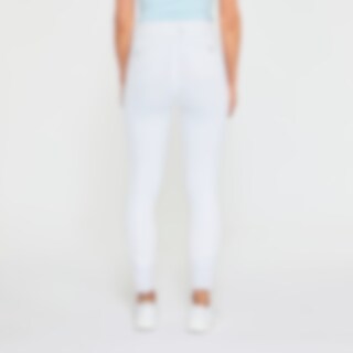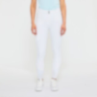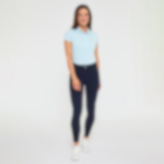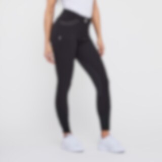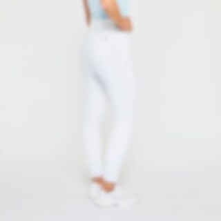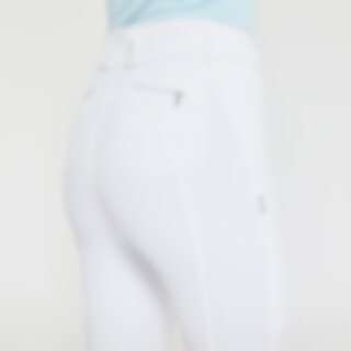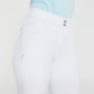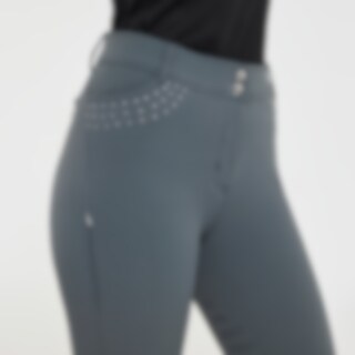 Vevd ridebukse med salsnitt i elastisk funksjonsmateriale. Formfast kvalitet som er slitesterk, smussavvisende og meget behagelig å ha på. Kneforsterket med grep som fortsetter på innsiden av lårene for optimalt feste og støtte i salen uten at buksen er helforsterket. Elastikk ved anklene. Normalhøyt liv med to knapper som gjør at ridebuksen sitter godt på plass og gir økt komfort. To lommer foran og to lommer med glidelås bak. Diskré mobillomme med glidelås på utsiden av låret. Pen detalj med strassperler ved lommene som gir en elegant stil. Noe liten i passformen, vi anbefaler derfor at du går opp en størrelse.