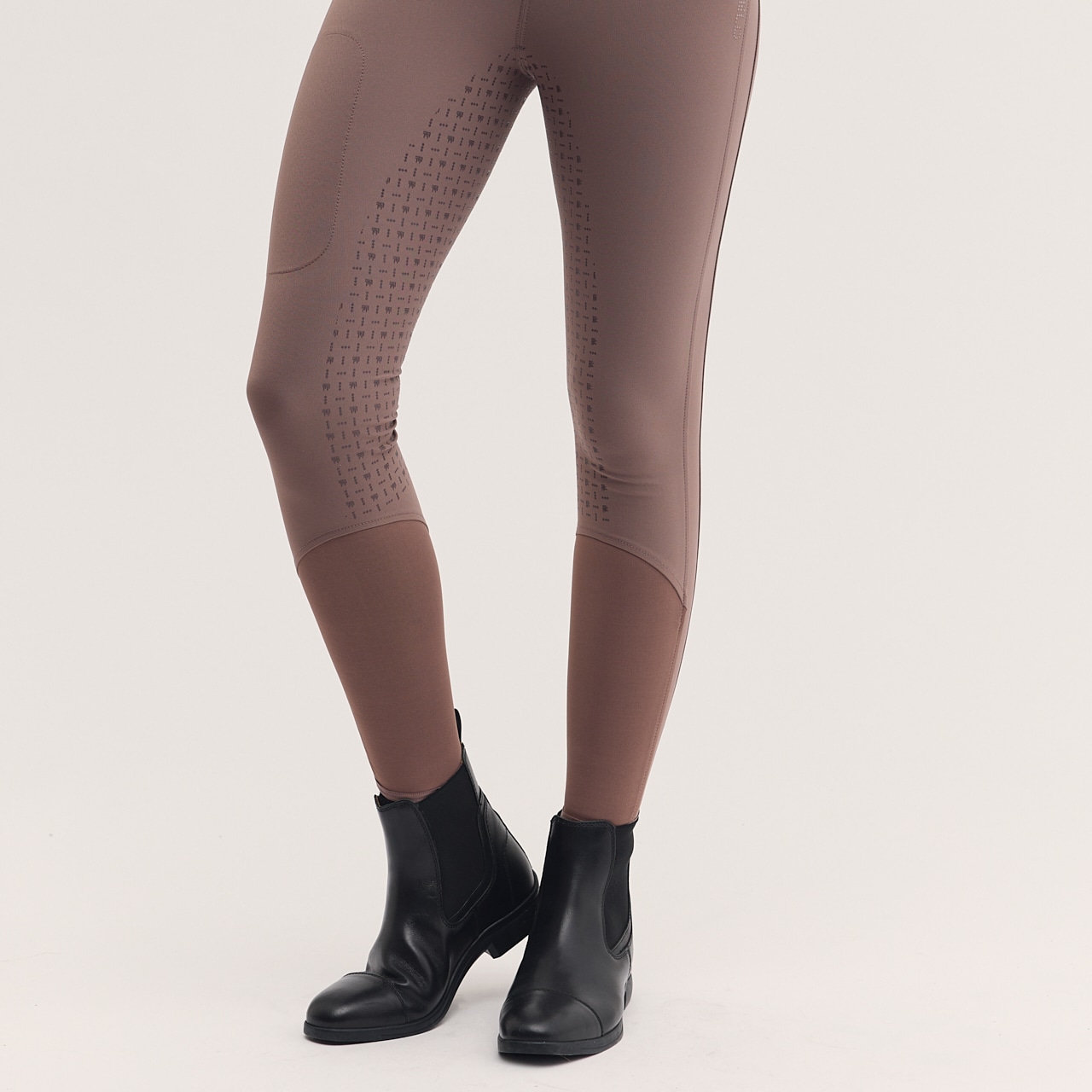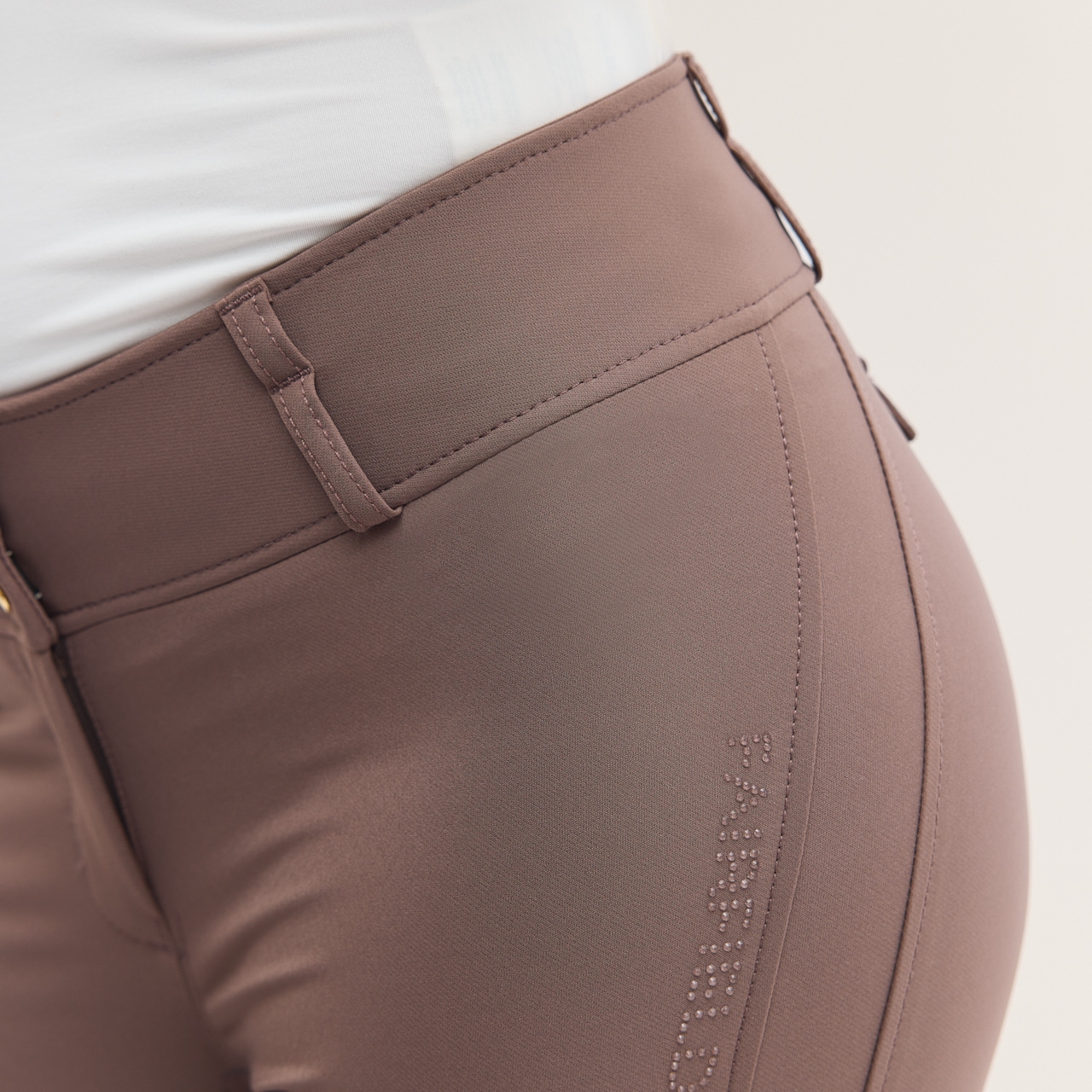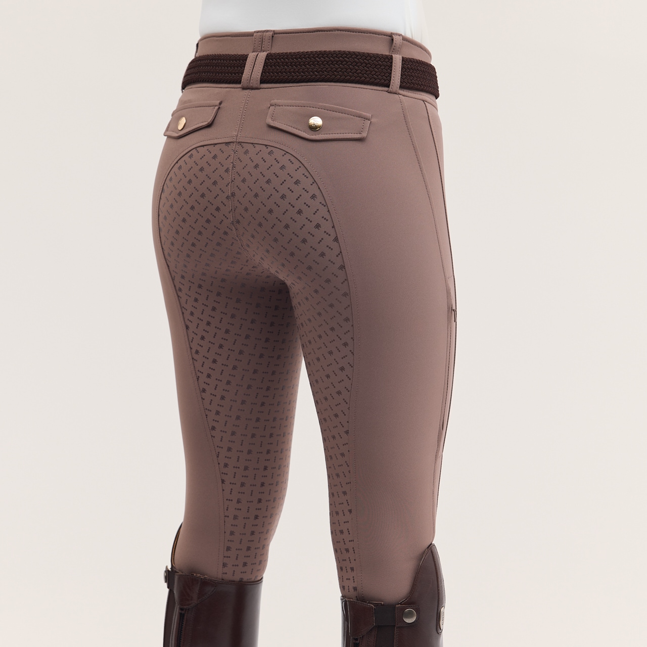 Ridebukse i vevd, hurtigtørkende funksjonelt materiale med høy pusteevne. Det elastiske materialet gir god smidighet. Helforsterket med grep som gir et mykt feste i salen. Normalhøy midje med dobbel lukking for å sikre at ridebuksene sitter godt på plass