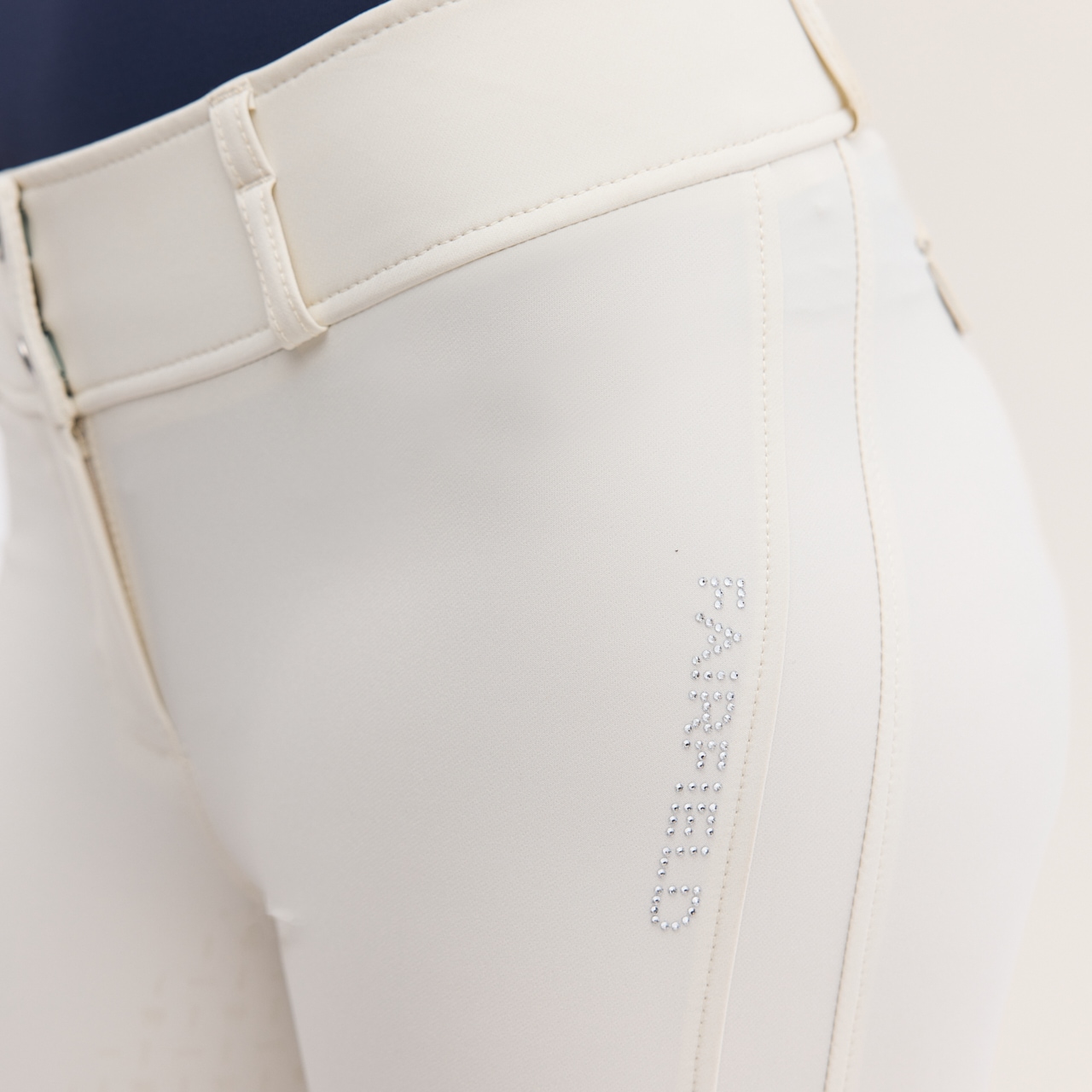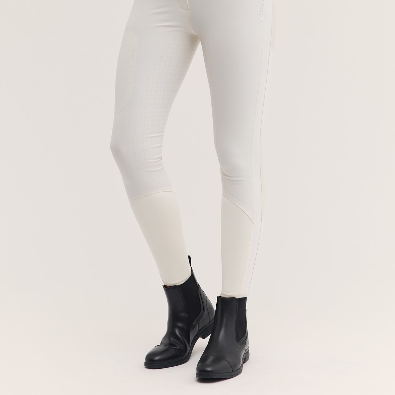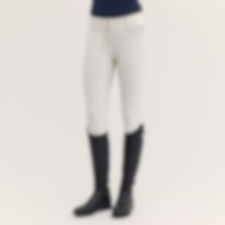 Ridebukse i vevd, hurtigtørkende funksjonelt materiale med høy pusteevne. Det elastiske materialet gir god smidighet. Helforsterket med grep som gir et mykt feste i salen. Normalhøy midje med dobbel lukking for å sikre at ridebuksene sitter godt på plass