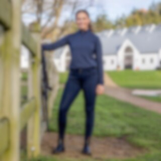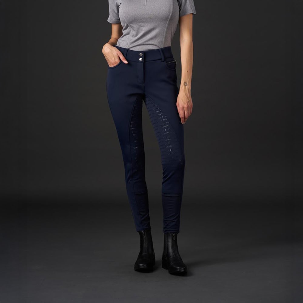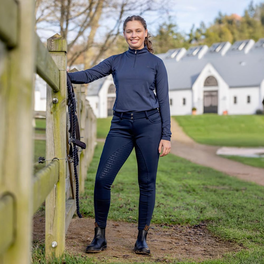 Varme, myke ridebukser med høy midje og silikongrep i hele setet og EQUIPAGE-logo i stripete mønster. (MIDDELS HØY). Glatt overflate av teknisk kvalitet med børstet innside og god formbevaring. Glidelås foran.