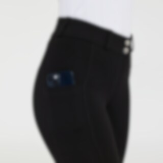 Stilren ridetights i trikotmateriale med salsnitt. Myk og elastisk, noe som gjør den meget behagelig å ha på. Diskré mobillomme på hvert ben. Normalhøyt liv med dobbel lukking for at buksen skal sitte sikkert på plass og gi økt komfort. Midjebåndet er høy