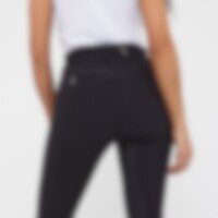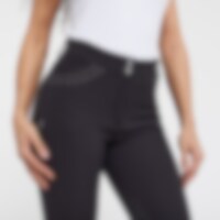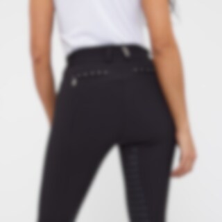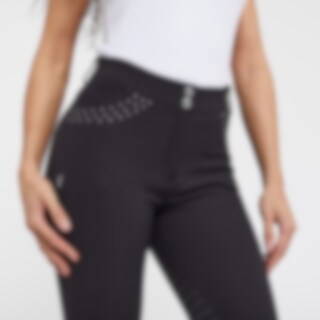 Vevd ridebukse med salsnitt i elastisk funksjonsmateriale. Formfast kvalitet som er slitesterk, smussavvisende og meget behagelig å ha på. Kneforsterket med grep som fortsetter på innsiden av lårene for optimalt feste og støtte i salen uten at buksen er helforsterket. Elastikk ved anklene. Normalhøyt liv med to knapper som gjør at ridebuksen sitter godt på plass og gir økt komfort. To lommer foran og to lommer med glidelås bak. Diskré mobillomme med glidelås på utsiden av låret. Pen detalj med strassperler ved lommene som gir en elegant stil. Noe liten i passformen, vi anbefaler derfor at du går opp en størrelse.
