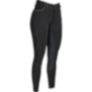 Salskåret ridebukse i resirkulert polyester, helforsterket med Daewoo. To åpne lommer foran og én mobillomme med glidelås på høyre lår. Hemper i livet og trikot ved ankler. Passepoil i kontrastfarge på hempene og lommene foran.