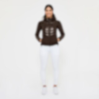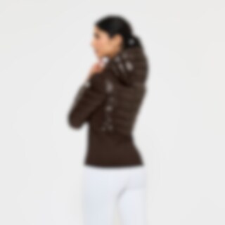 Figurnær hybridjakke med skimmereffekt på stoffet. Polstret med polyestervatt. Sidepaneler i power stretch fleece med børstet innside som gir optimal komfort og passform. Avtakbar hette og krage med fleece på innsiden. Praktisk toveis glidelås med hakebeskyttelse. Lommer med teipede glidelåser i lakk.