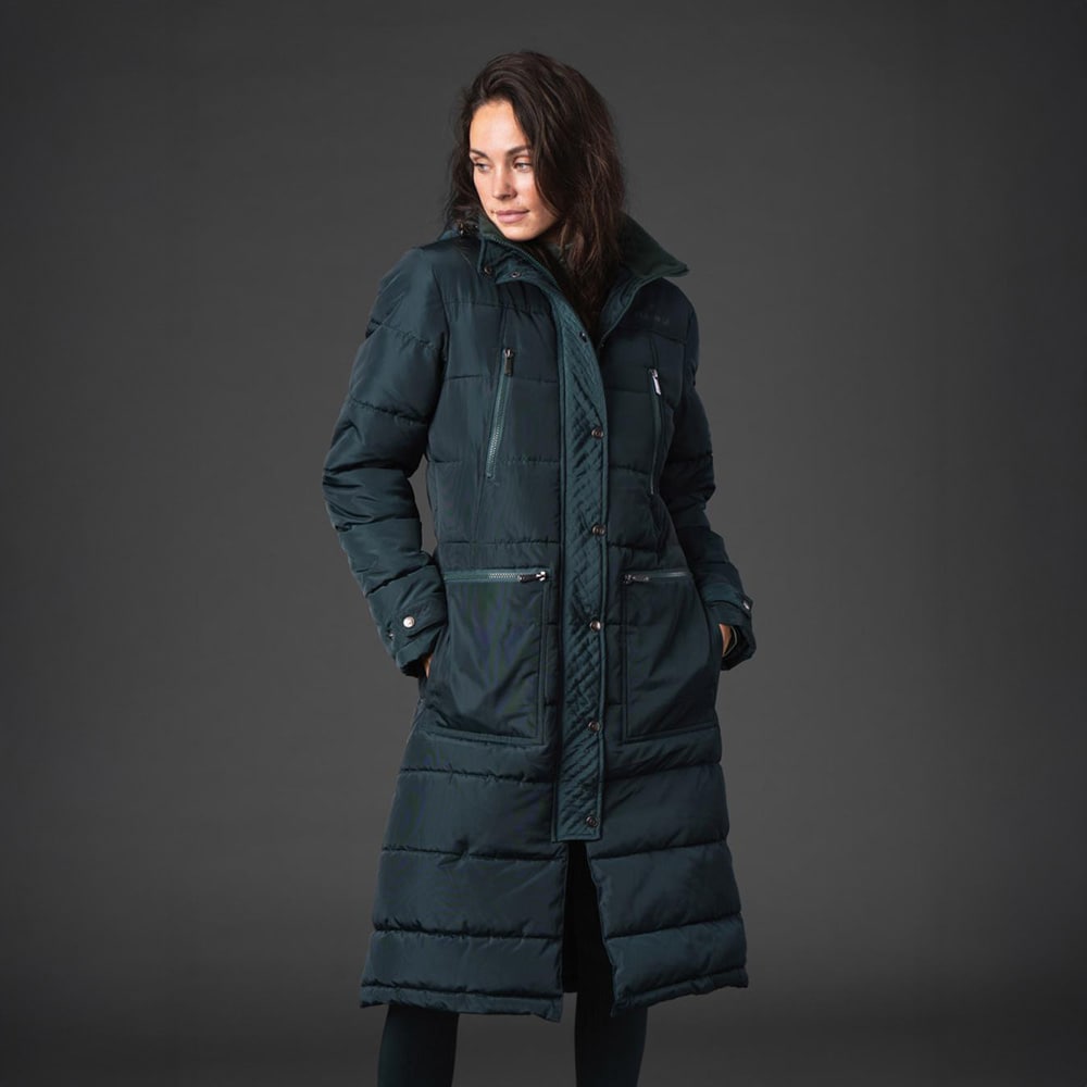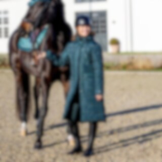 Lang frakk i vattert modell med vannavvisende overflate med vannsøyle opp til 5000 mm. Teipede sømmer, avtakbar hette. Glidelås som åpnes i begge retninger. 100 % polyester. og pustefunksjon med 3000mvp. Polyesterfôr med en dunlignende følelse. Teipede sømmer over de mest utsatte områdene. To lange glidelåser bak som åpner opp et stort åk som kan legges over hestens rygg og den bakre buen på salen. Lang glidelås foran som åpnes i begge retninger. Fleecefôret krage og innsiden av lommene for en ekstra koselig følelse. På innsiden er det en elastisk stropp til å feste rundt benet i en lapp som legges over låret for å beskytte mot fuktighet også der. Avtakbar hette. 100 % polyester.
