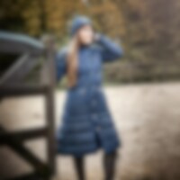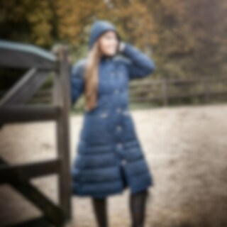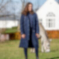 Lang frakk i vattert modell med vannavvisende overflate med vannsøyle opp til 5000 mm. Teipede sømmer, avtakbar hette. Glidelås som åpnes i begge retninger. 100 % polyester. og pustefunksjon med 3000mvp. Polyesterfôr med en dunlignende følelse. Teipede sømmer over de mest utsatte områdene. To lange glidelåser bak som åpner opp et stort åk som kan legges over hestens rygg og den bakre buen på salen. Lang glidelås foran som åpnes i begge retninger. Fleecefôret krage og innsiden av lommene for en ekstra koselig følelse. På innsiden er det en elastisk stropp til å feste rundt benet i en lapp som legges over låret for å beskytte mot fuktighet også der. Avtakbar hette. 100 % polyester.