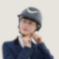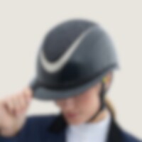Ridehjelm i høyglanset metallisk finish, dekorert midtplate og dekorativ detalj over bremmen. Lav vekt og ventilasjon foran og bak gjør hjelmen behagelig å ha på under hele rideøkten. Justerbar med skrue bak for gode monteringsmuligheter. Trepunktsfeste m