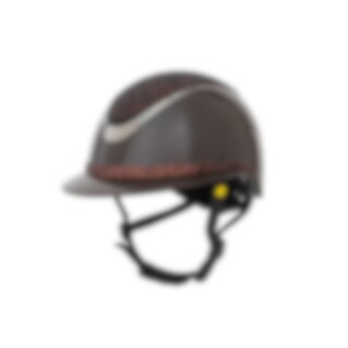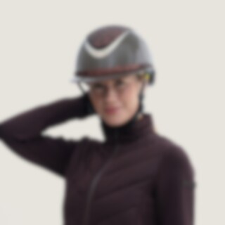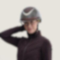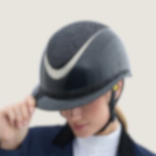 Ridehjelm i høyglanset metallisk finish, dekorert midtplate og dekorativ detalj over bremmen. Lav vekt og ventilasjon foran og bak gjør hjelmen behagelig å ha på under hele rideøkten. Justerbar med skrue bak for gode monteringsmuligheter. Trepunktsfeste m