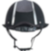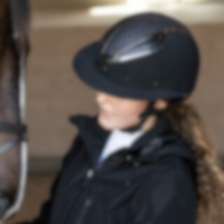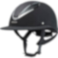 Ridehjelm med utside i mikromocca og dekorert med glitter. Justerbar med en skrue bak slik at passformen kan finjusteres. Noe bredere skjerm for å beskytte mot sollys eller sterkt lys fra lyskaster. Uttakbart og vaskbart innerfôr.