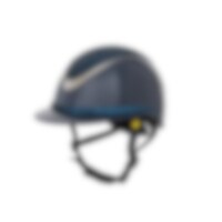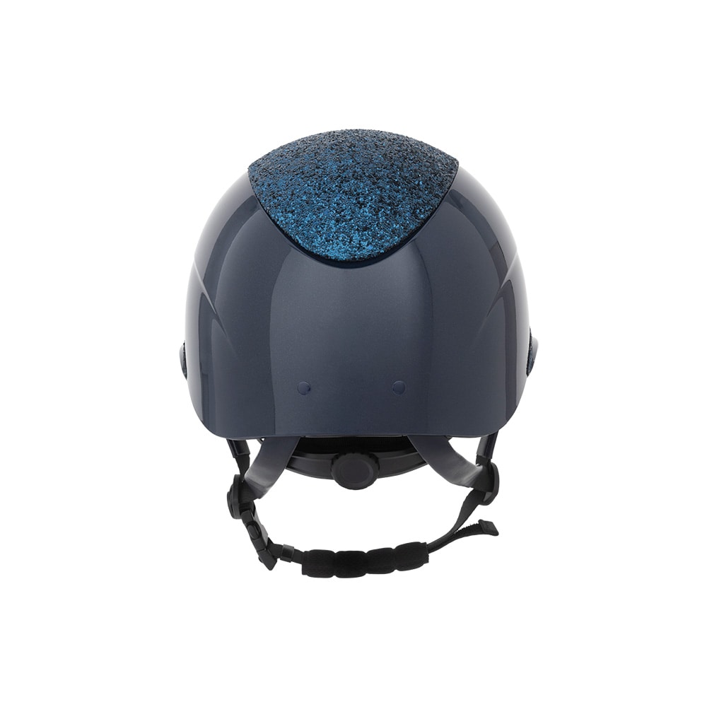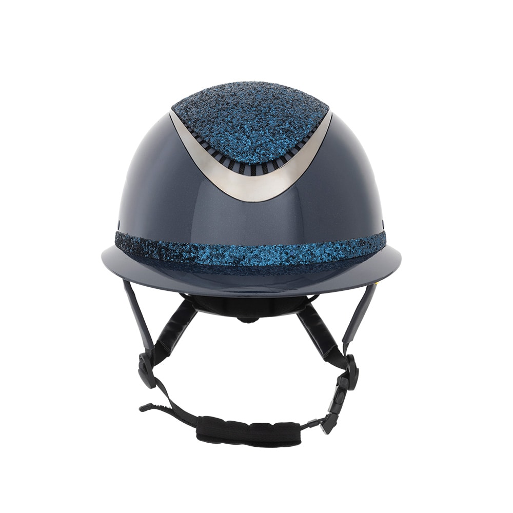 Ridehjelm i høyglanset metallisk finish, dekorert midtplate og dekorativ detalj over bremmen. Lav vekt og ventilasjon foran og bak gjør hjelmen behagelig å ha på under hele rideøkten. Justerbar med skrue bak for gode monteringsmuligheter. Trepunktsfeste m