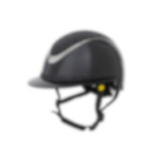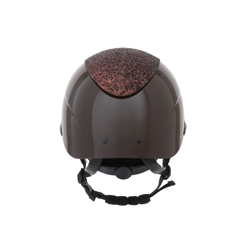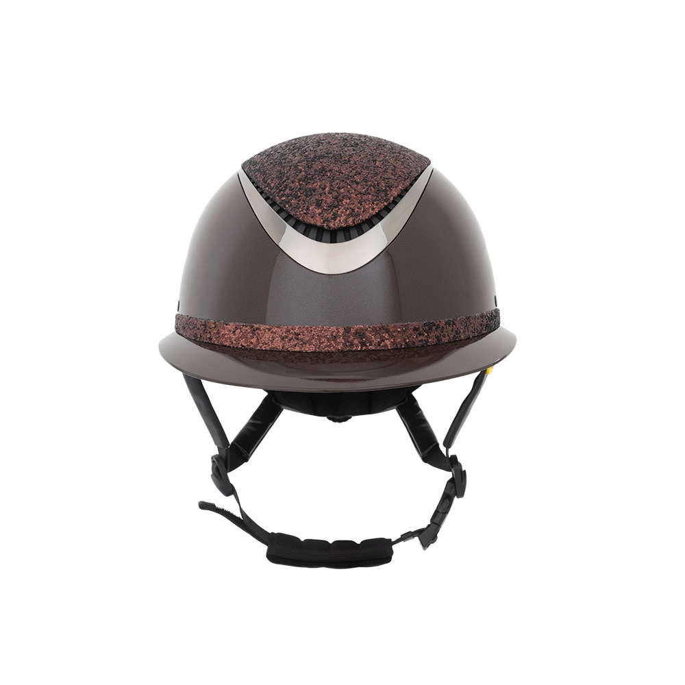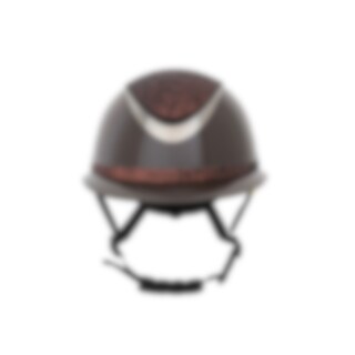Ridehjelm i høyglanset metallisk finish, dekorert midtplate og dekorativ detalj over bremmen. Lav vekt og ventilasjon foran og bak gjør hjelmen behagelig å ha på under hele rideøkten. Justerbar med skrue bak for gode monteringsmuligheter. Trepunktsfeste m