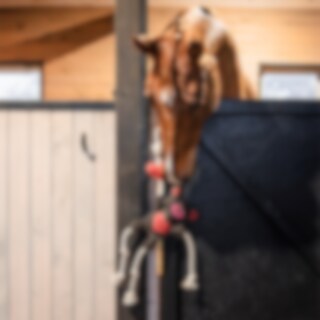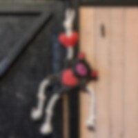 Boksleketøy laget av slitesterkt, mykt polstret semsket skinn formet som en bamse. Lett å feste i boksen. Ca 31 x 23 cm uten tau.
