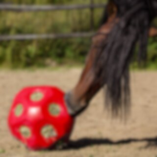 Høyball i solid plast som kan brukes både i innhegning og boks. Sysselsetter hesten over lang tid, rommer ca. 3 kg høy. 19 stk. hull, ca. 6 cm store. 40 cm i diameter. Tenk på at du ikke bruker høyballen til mindre hester/føll da de kan sette fast hoven i den. Det finnes også noen få kjente tilfeller der hester har satt fast kjeven i høyballer av ulike merker. Hvis mulig, ha din hest under oppsikt.